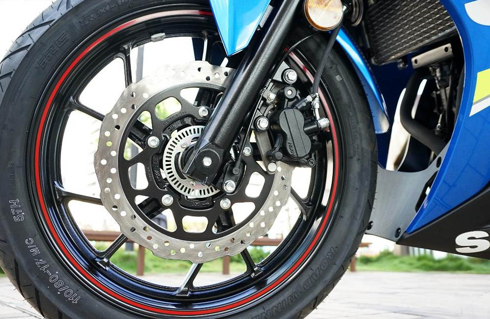 鈴木GSX-250R的制動方面,前輪采用290mm單盤式制動+雙活塞卡鉗 ,后輪采用240mm單盤式制動+單活塞卡鉗,配備雙通道ABS防抱死系統(tǒng)。