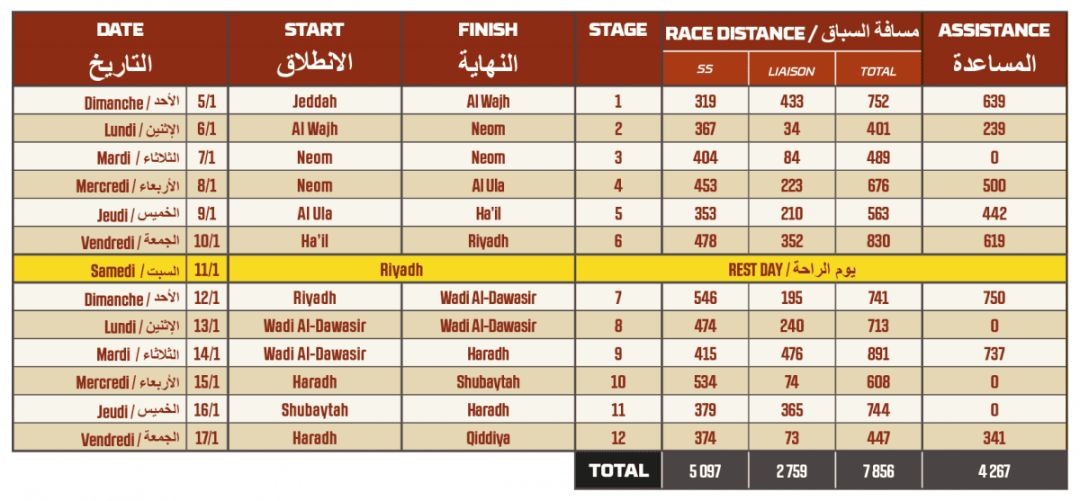2020達喀爾將于2020年1月5日至17日從紅海岸邊的達吉開始,在首都利雅得設(shè)一個休息點,最后在齊迪亞結(jié)束,共13天,其中一天是休息日。全長7500公里,其中包含5000公里的特殊賽段,軟沙、戈壁、礫石、沙丘、峽谷、山脈、干枯的河道等復雜地形都不會缺席。