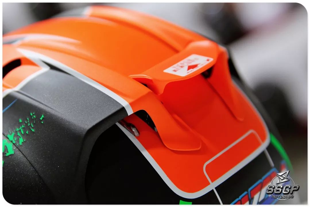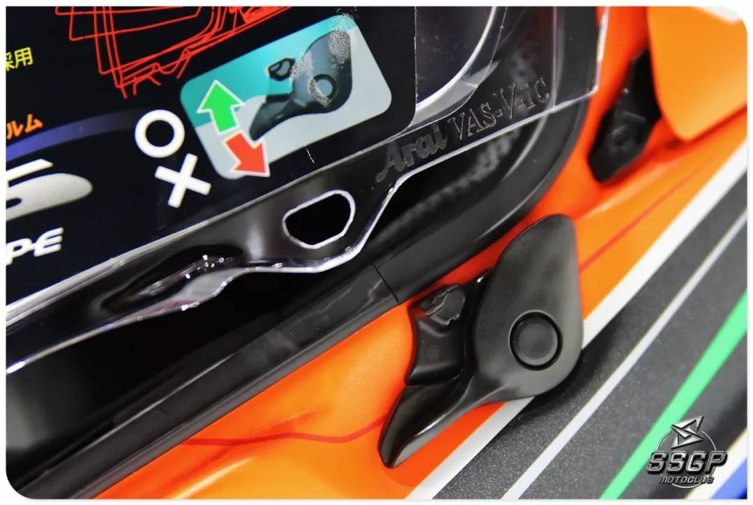 VAS 可變軸心系統(tǒng)(Variable Axis System)。雙軸心移動的方式,讓鏡片座降低了 24mm,并保持跟上一代產品 RR5 同樣幅度的鏡片開閉行程。降低高度的目的在于將鏡片座整體放到 SNELL 測試線下方,提升頭盔在受撞擊時的穩(wěn)定性和安全性,并有效降低鏡片在撞擊時脫落的概率。