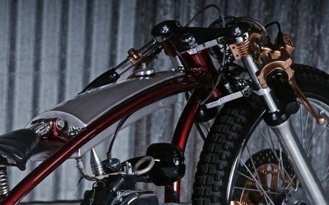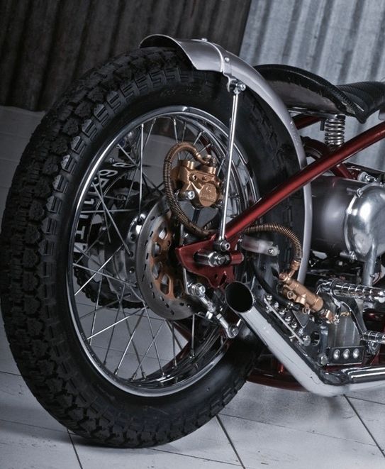 在美國(guó),直線加速賽興起于20世紀(jì)30年代,大概是在二戰(zhàn)時(shí)期開(kāi)始萌發(fā)。最初是在加利福利亞州的干燥的河床上進(jìn)行的直線加速賽,后來(lái)被命名為DRAG RACING,之后在50-60年代全面流行起來(lái)。而這臺(tái)改裝車便有著典型的Drag Racer風(fēng)格,整車結(jié)構(gòu)非常低矮,向下彎折的低手把和靠后的皮坐墊形成低趴的騎行三角。整車外觀非常簡(jiǎn)潔有力,視覺(jué)重心僅有兩個(gè)三輪和發(fā)動(dòng)機(jī)三點(diǎn),并將帶狀油箱附著于車架上,使其視覺(jué)最小化,削弱存在感。紅色的主車架與銀色涂裝的外觀件配合相得益彰,前后制動(dòng)系統(tǒng)的部件全部采用了古銅色則是給予了很好的點(diǎn)綴,質(zhì)感十足。