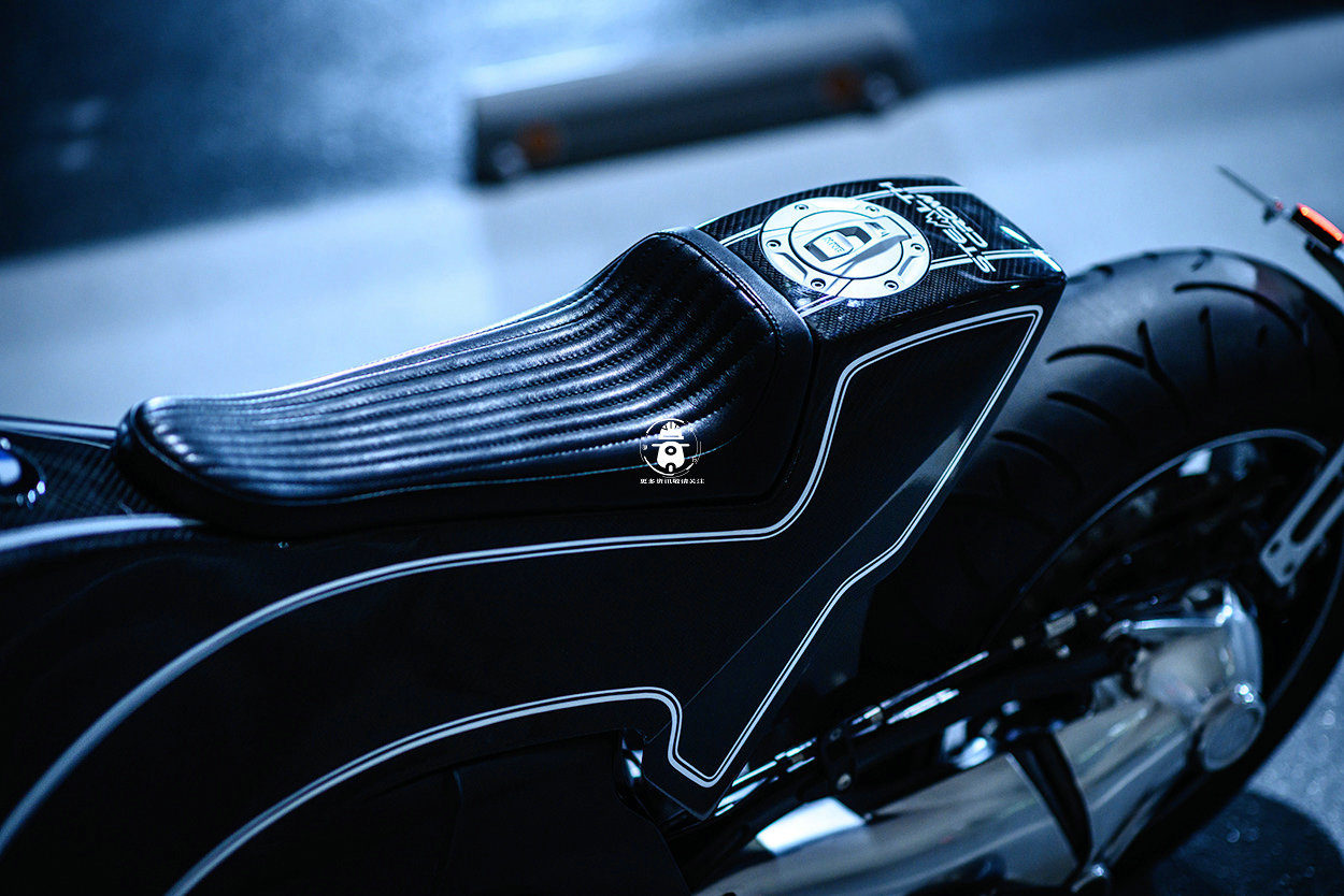 去除了前叉和擺臂的黑色飾面,并對其進(jìn)行了拋光,他們還制造了一個新的擋泥板,后擋泥板后伸出一個支架以固定車牌和尾燈。典型的BMW雙白色細(xì)條紋包裹在裸露的碳纖維上,從而勾勒出整個車身線條曲線。