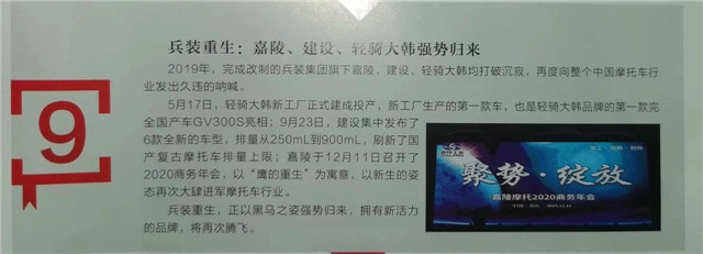在白皮書的刊述上列舉了2019這一年摩托車行業(yè)的十大事件,其中令人振奮矚目的一條便是《兵裝重生——嘉陵等兵裝系的強(qiáng)勢(shì)歸來》,再度向整個(gè)中國(guó)摩托車行業(yè)發(fā)出久違的吶喊。