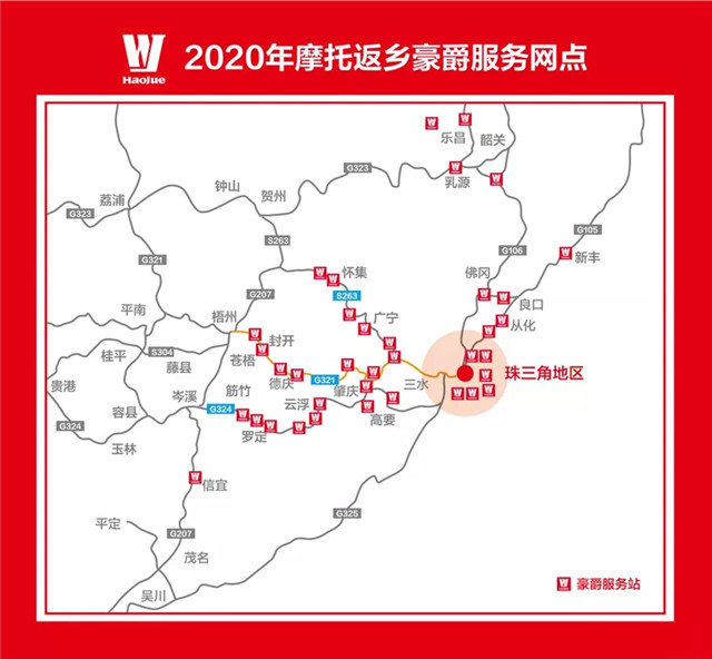 今年,豪爵將延續(xù)去年的做法,集中精力于廣東境內(nèi)的摩托返鄉(xiāng)主干道沿線,開設(shè)37家返鄉(xiāng)服務(wù)站,主要覆蓋:珠三角地區(qū)、粵北地區(qū)、國道G321沿線、國道G324沿線、省道S263沿線等主要返鄉(xiāng)區(qū)域;相較去年,豪爵今年在國道G321、 G324返鄉(xiāng)人流密集路段,又新增了6家服務(wù)站,以方便更精準(zhǔn)、更高效服務(wù)返鄉(xiāng)人群。