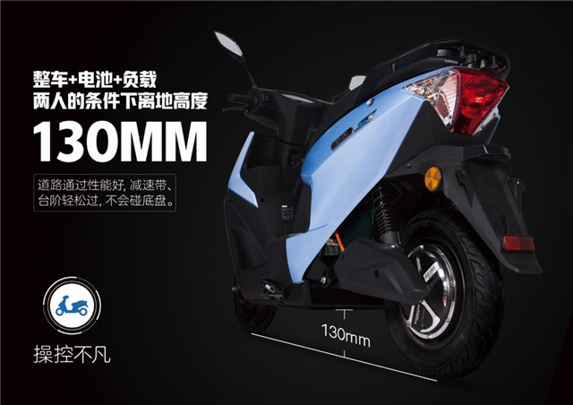 整車+電池+乘坐2人的條件下,依然有130mm的離地高度,道路通過性更強,輕松跨過小臺階和減速帶。