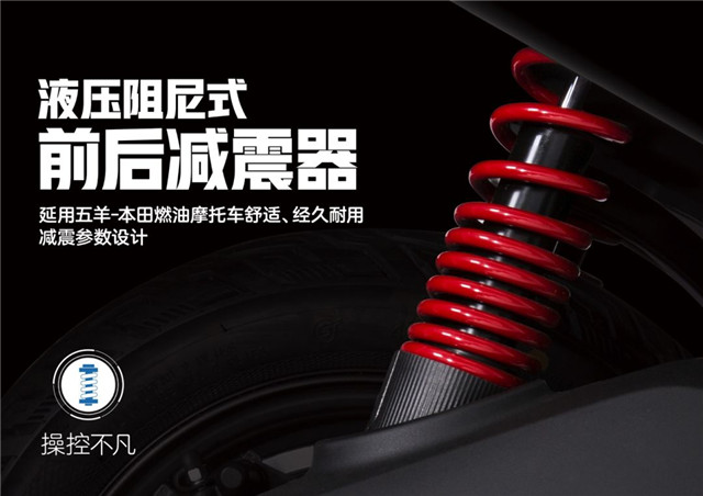 搭配液壓阻尼式前后減震器,以及高性能前后碟剎,剎車距離更短,安全性能優(yōu)越。