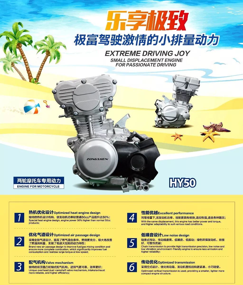 與夢 50 相同的做功規(guī)格、宗申 DOHC 發(fā)動機(jī) HY50