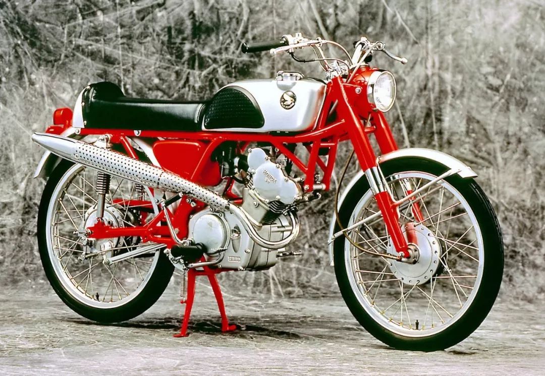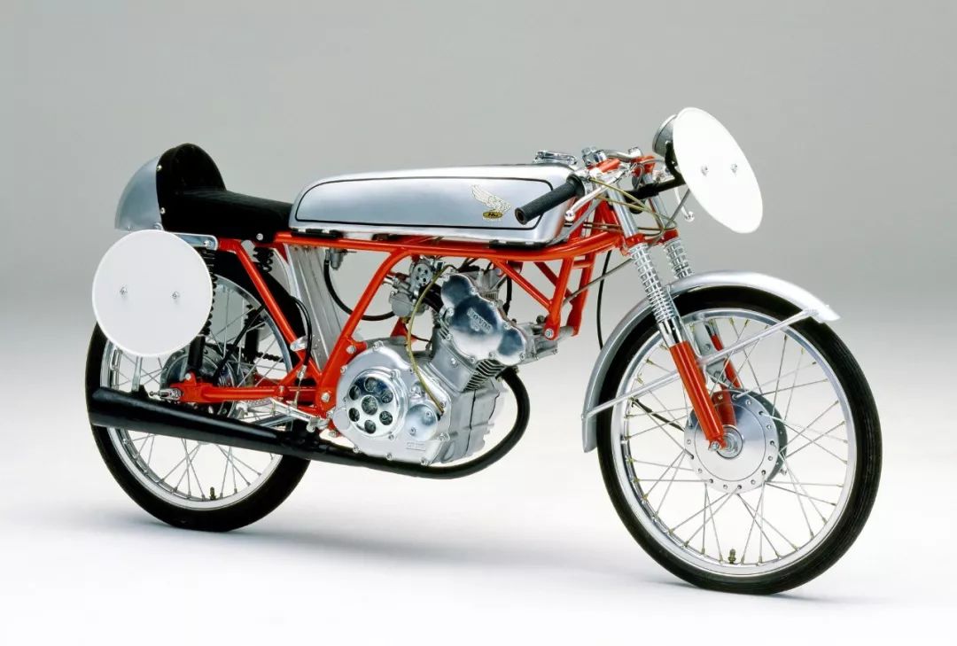 下圖:Honda 1961 - 1962 工廠賽車 CR110 Cub Racing 工廠賽車。該賽車的工廠代號為 RC110/RC111,屬于當(dāng)時的 WGP 50 級別。搭載一副風(fēng)冷四沖程單汽缸、DOHC 的發(fā)動機(jī),初期型的缸徑、行程為 40 mm × 39 mm,后期型采用 40.4 mm × 39 mm,最大動力輸出 7.1 kw(約 9.5 匹)在 14,000 rpm 區(qū)域爆發(fā),采用了干式離合器,并有 5 個檔、6 個檔、8 個檔、9 個檔,四個不同配置的變速齒輪箱,對應(yīng)不同的賽道應(yīng)用環(huán)境。車體采用鋼管式的車架,直徑為 18 英寸的車輪,全車重量只有 45 公斤(干燥重量)、60 公斤(整備重量)。