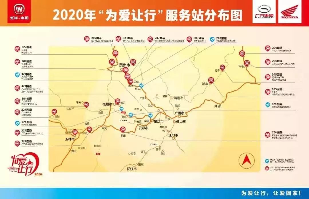 2020年,五羊-本田連續(xù)第10年攜手廣東肇慶、廣西賀州、梧州等地政府部門,繼續(xù)在G321、G324、G207、S263等國道、省道年前、年后共設(shè)立25個“為愛讓行”服務(wù)站,繼續(xù)為返鄉(xiāng)的摩托大軍提供專業(yè)、安全、貼心的愛心服務(wù)。五羊-本田準(zhǔn)備的愛心大禮包也通過網(wǎng)上預(yù)約的形式送到返鄉(xiāng)車友的手中。除此之外,只要求助者撥打救援和服務(wù)熱線,返鄉(xiāng)沿線的所有五羊-本田服務(wù)站都將為返鄉(xiāng)車友提供幫助和救援……