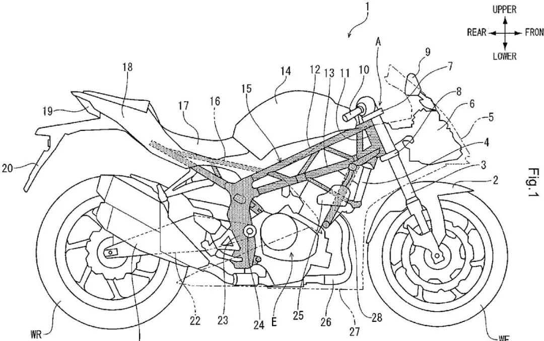 下圖:此前被公開的、關(guān)于新一代 CBR250RR 的部分技術(shù)專利公示圖。