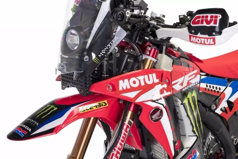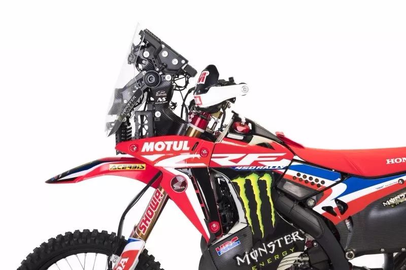 本田的CRF 450 Rally是根據(jù)達(dá)喀爾比賽打造的,外觀方面可以看成是放大版的CRF 250 Rally,高聳的車頭,一體化車座以及大直徑輻條輪轂營(yíng)造一種矯健的車身外觀。而在配置方面也是量產(chǎn)車所不能比擬的,儀表部分配有路書盒以及里程表等必要設(shè)備,車把按鍵也是賽車規(guī)格的。車架方面為鋁合金車架,副車架加入了碳纖維材質(zhì),以減輕車重,前減震為Showa倒立式51mm全可調(diào)前叉,行程310mm,后減震為Showa 50mm單筒全可調(diào)減震器,行程315mm。而為了應(yīng)對(duì)長(zhǎng)距離的比賽,這款車上配有前后兩個(gè)塑料油箱,總?cè)莘e加起來(lái)有33.7L。