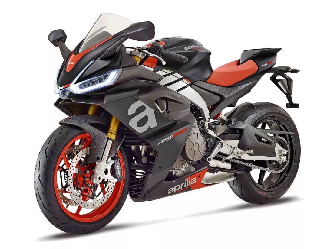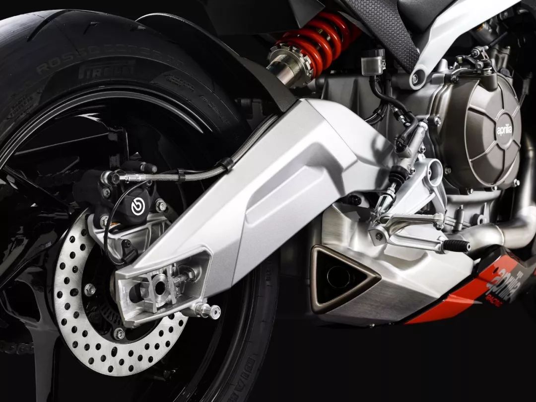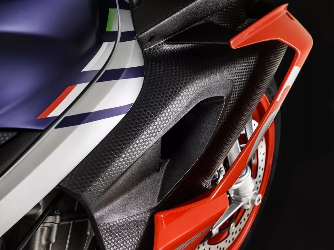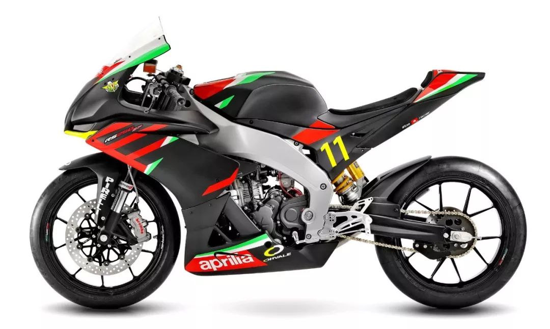 車體方面,采用了一副鋁合金雙翼樑式的車架,整流罩的結(jié)構(gòu)特點(diǎn)明顯是來(lái)自 V4 的,前整流罩采用了雙層式的設(shè)計(jì)、并以之作為一個(gè)完整的空氣動(dòng)力附件。乘坐位置的設(shè)計(jì)考慮到了舒適性,有一個(gè)相對(duì)較厚的鞍座,不太高的腳踏位置,以及安裝在前叉上方、稍微上揚(yáng)安裝的車把。而全車重量?jī)H為 169 公斤。在初階段,新車將提供兩個(gè)外觀圖案:一個(gè)是黑色為主調(diào)、襯以紅色的標(biāo)準(zhǔn)圖案;另一個(gè)則是向當(dāng)年搭載 RGV250r 兩沖程發(fā)動(dòng)機(jī)的中量級(jí)車型 1994' RS250 Reggiani Replica 雷基安尼( 注1)復(fù)制版致敬的、紫色與紅/白色相襯的圖案。
