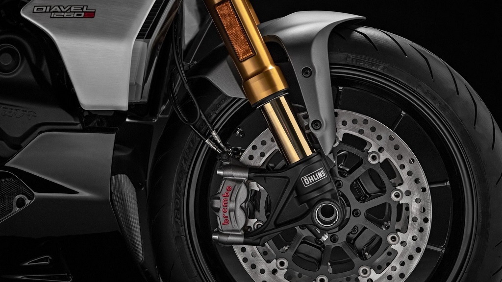 Diavel 1260S 2020的懸掛系統(tǒng)包括,尺寸為48mm的Ohlins伸縮式前叉和帶鑄鋁曲柄的可調(diào)節(jié)后單震減震器。