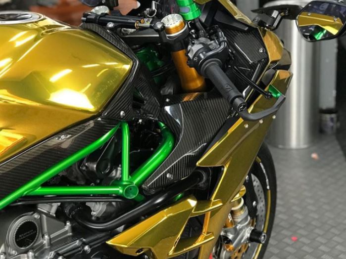 川崎Ninja H2本身就有極具侵略性的外觀,原廠設(shè)計的許多細(xì)節(jié),用以在道路上創(chuàng)造出最佳的空氣動力學(xué)性能。為了增加外觀的亮眼程度,車主使用了金屬電鍍和鍍鉻貼花貼紙的形式,創(chuàng)造了具有金色閃亮極有價值的外觀,鏡面的鍍金色亮眼程度爆表。