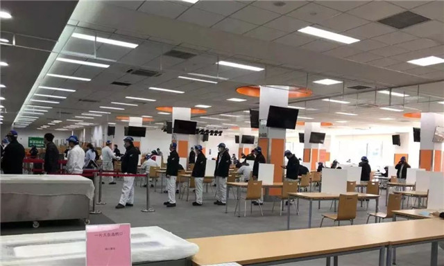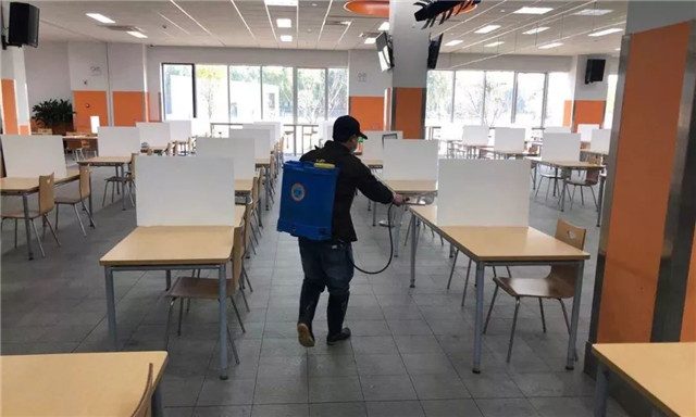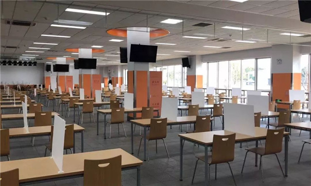 為對(duì)應(yīng)疫情,餐廳制定對(duì)應(yīng)措施,如設(shè)置套餐、對(duì)餐廳全面消毒、餐桌設(shè)置隔板單向就坐、對(duì)用餐人員進(jìn)行免洗消毒,上班第一天,員工有序就餐。
