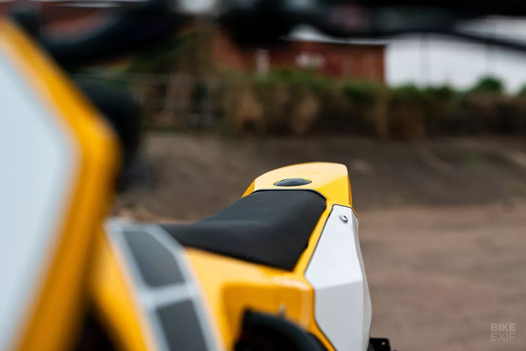 加油位置在重新打造過后的MT-07車上已經(jīng)移到車尾,可容納約9升的燃油。而前方原本的油箱造型上已經(jīng)更改為電瓶放置空間,「沒有其他花俏的加工,」Andrew說,「只需要焊工,G型夾與帶鋸工作臺(tái)就可以完成,改裝的部分都是手工制作,電瓶則是安裝在原本油箱位置的下方,空間很夠?!?/p>