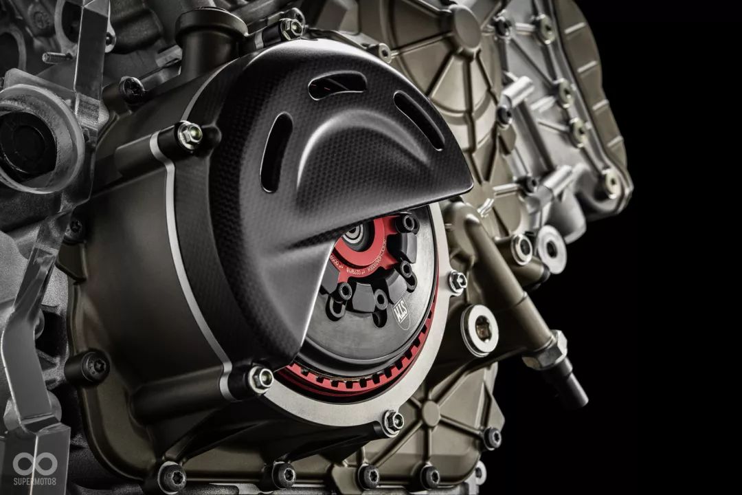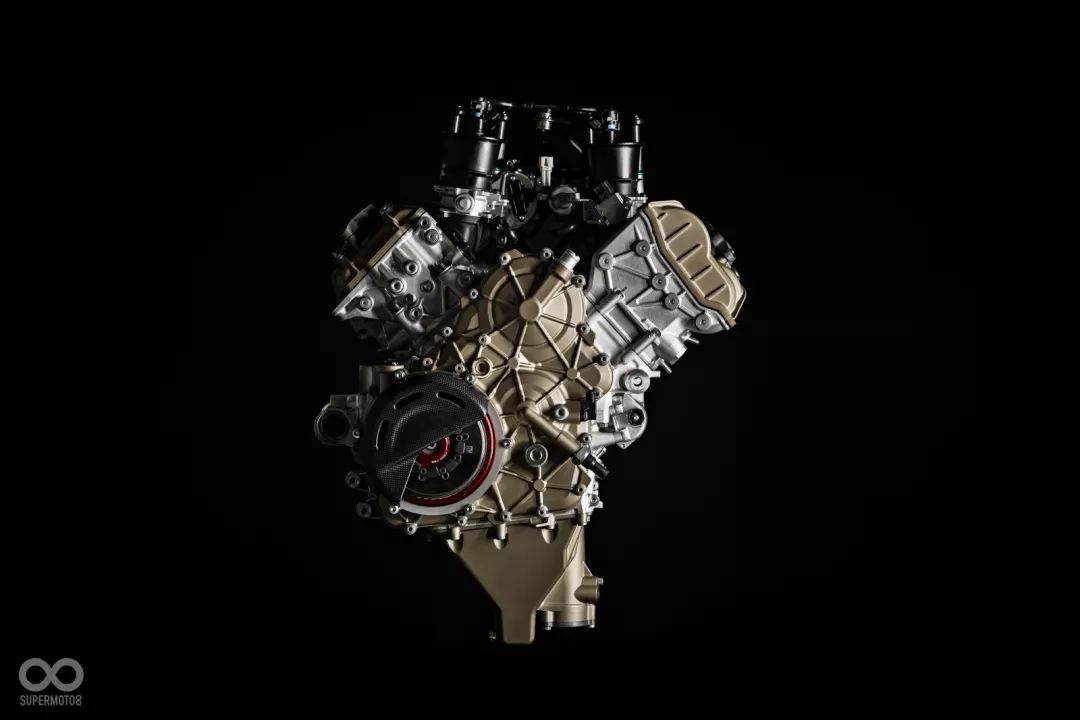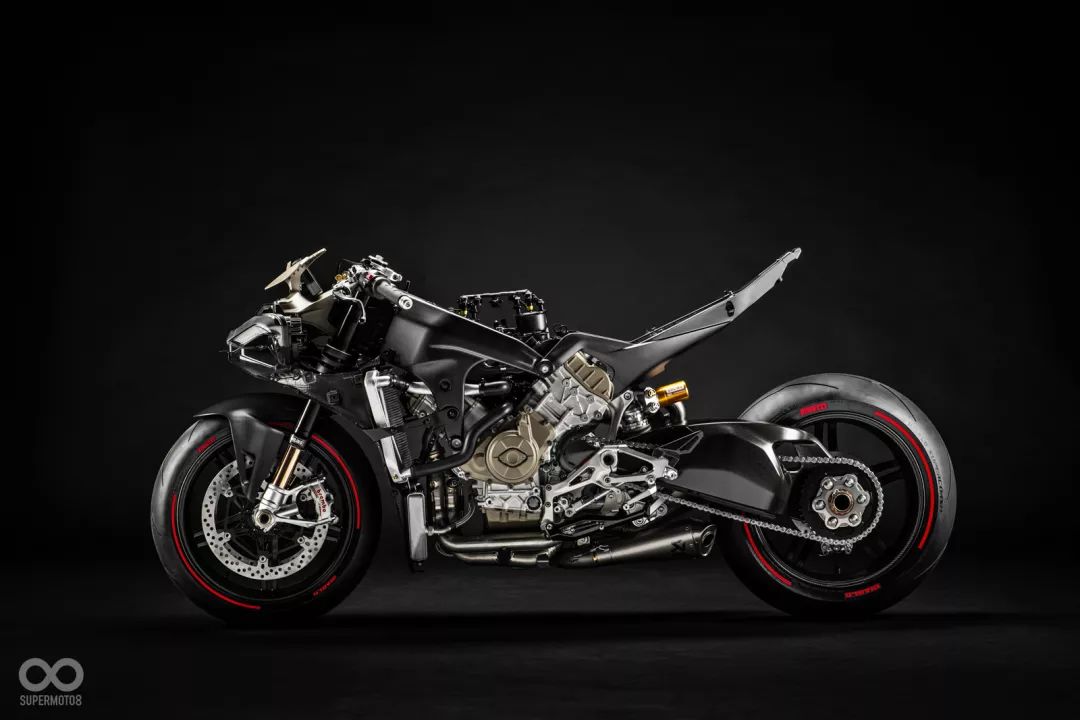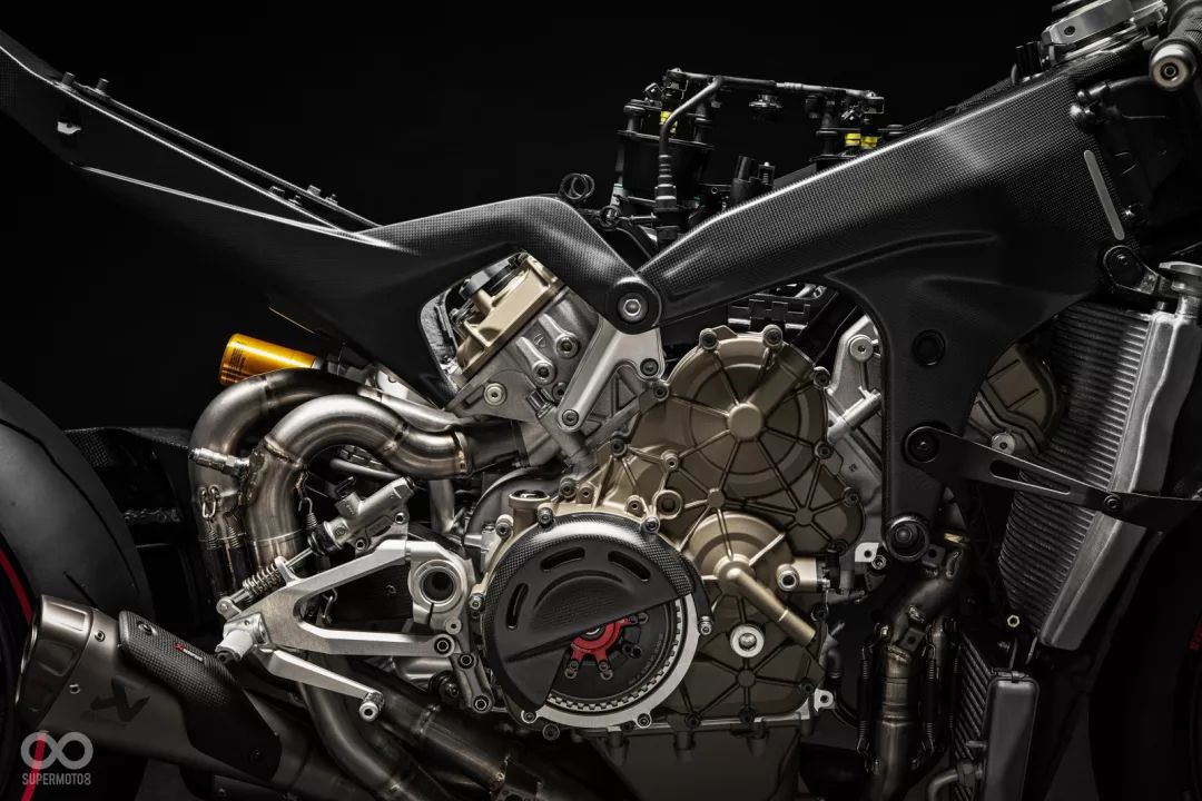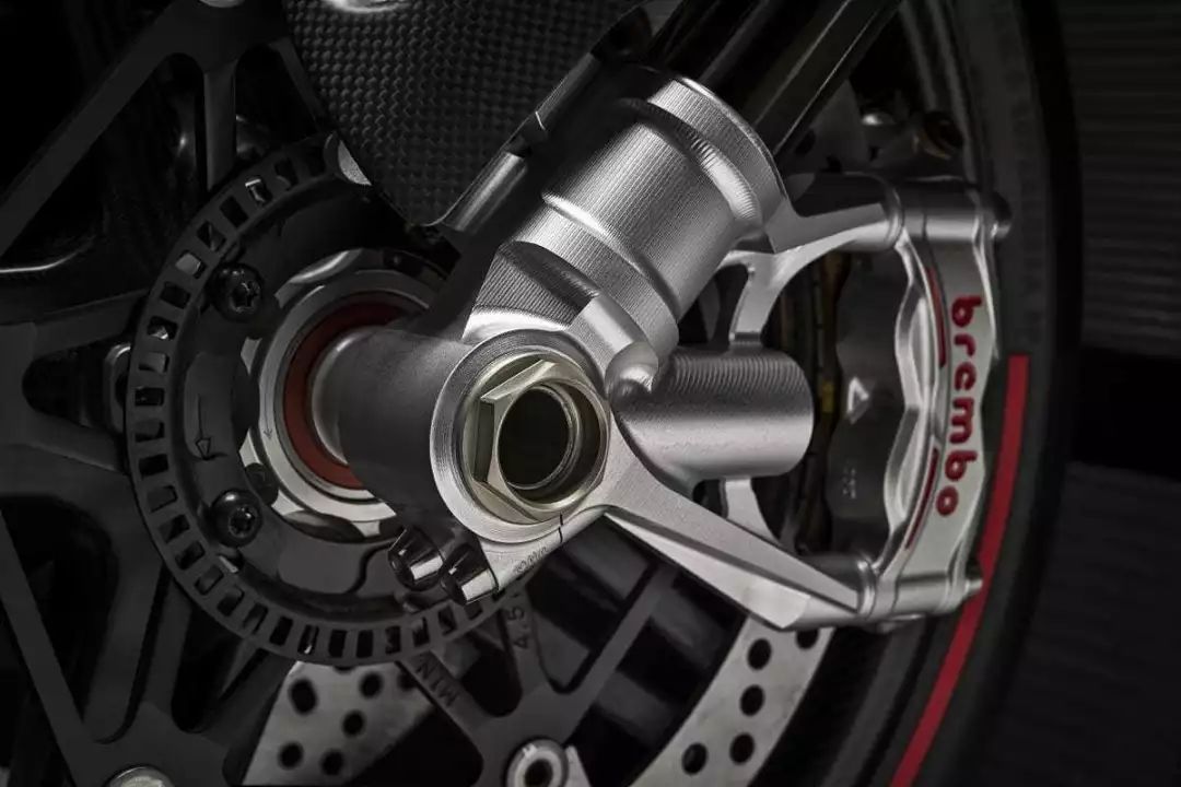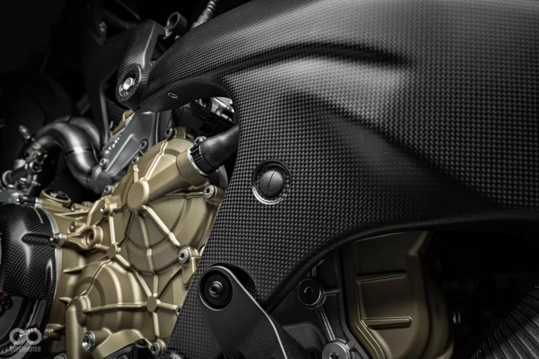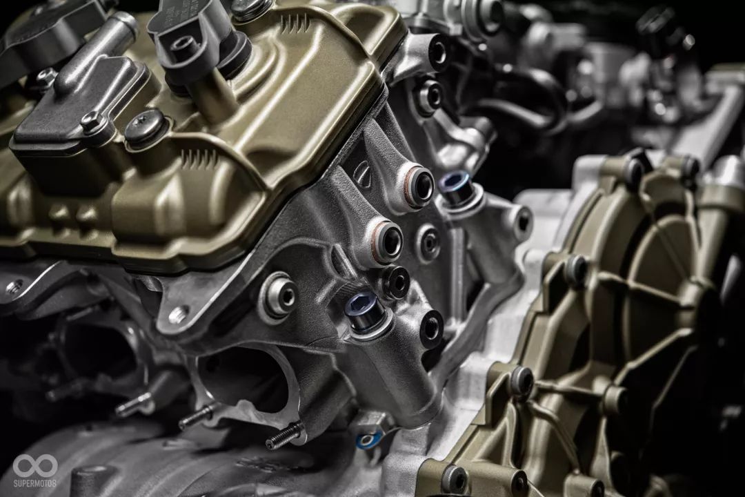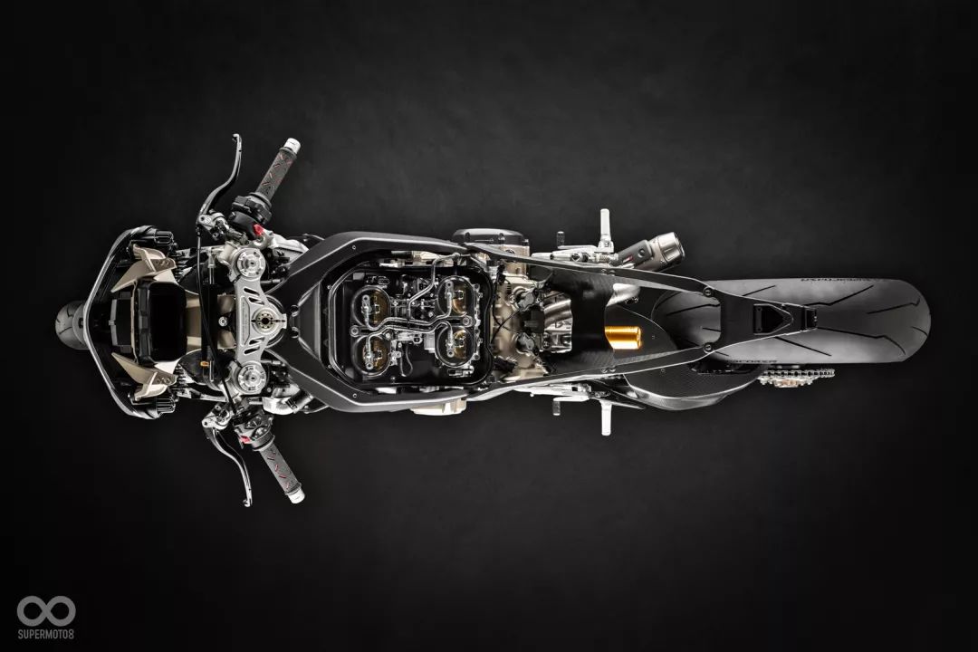 在眾多碳纖維零件的包裹下,那令人聞風喪膽的動力心臟同樣來自于Desmosedici Stradale R,998c.c. V4設(shè)定的他比起1,103c.c.的V4/V4S引擎還要輕2.8公斤,但經(jīng)過工程師的重新調(diào)校擁有224hp最大馬力,但這僅是合法道路設(shè)定,插上鈦合金Akrapovi?排氣管以及賽道設(shè)定后,馬力將暴漲至234hp,可以打敗WSBK廠車的驚人性能就此誕生。