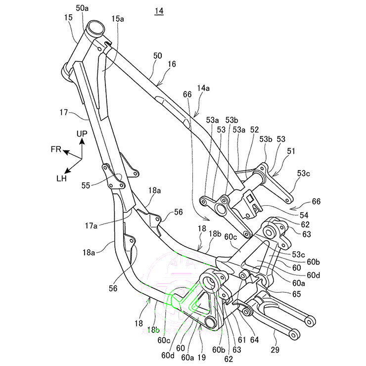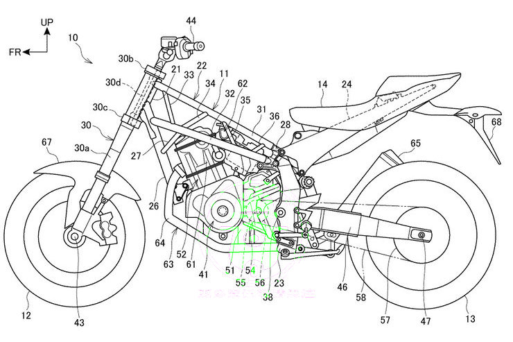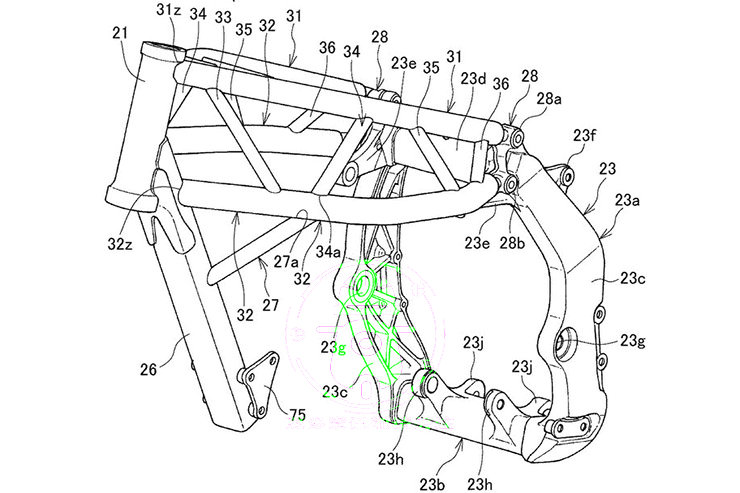 新專利展示了兩種完全不同的設(shè)計,它們似乎在為同一目標而競爭,一個是搖籃式的鋼制框架,帶有一個骨架和一個前下管,該下導(dǎo)管分成兩個發(fā)動機底架部分,第二個是具有運動外觀的底盤,其鋼格架式前部固定在鋁制擺臂樞軸元件上。