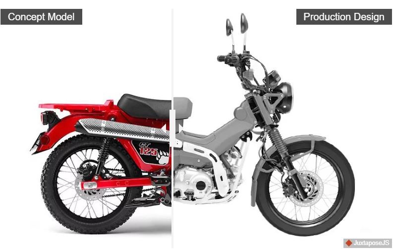 總體外觀相似,但是新設(shè)計中存在一些明顯的變化。125cc發(fā)動機(與新的Super Cub共用)看上去與概念車的動力裝置相同,但新設(shè)計的排氣系統(tǒng)經(jīng)過了改進,并帶有額外的隔熱層??蚣艿男螤钕嗨?,但有明顯的區(qū)別,包括增加了一個后搖臂樞軸板。座椅前方的車架上似乎還有一個小隔間,盡管這可能是出于維護目的而不是用于存放。