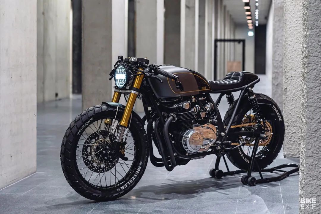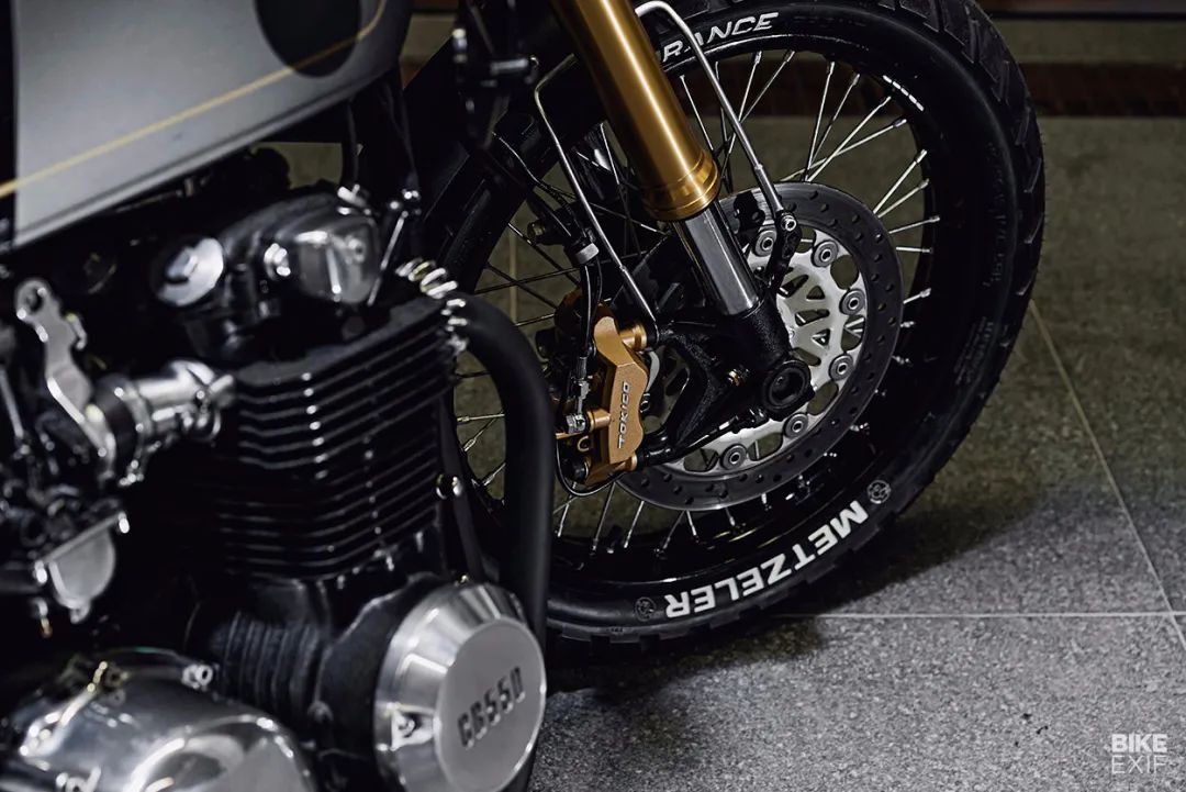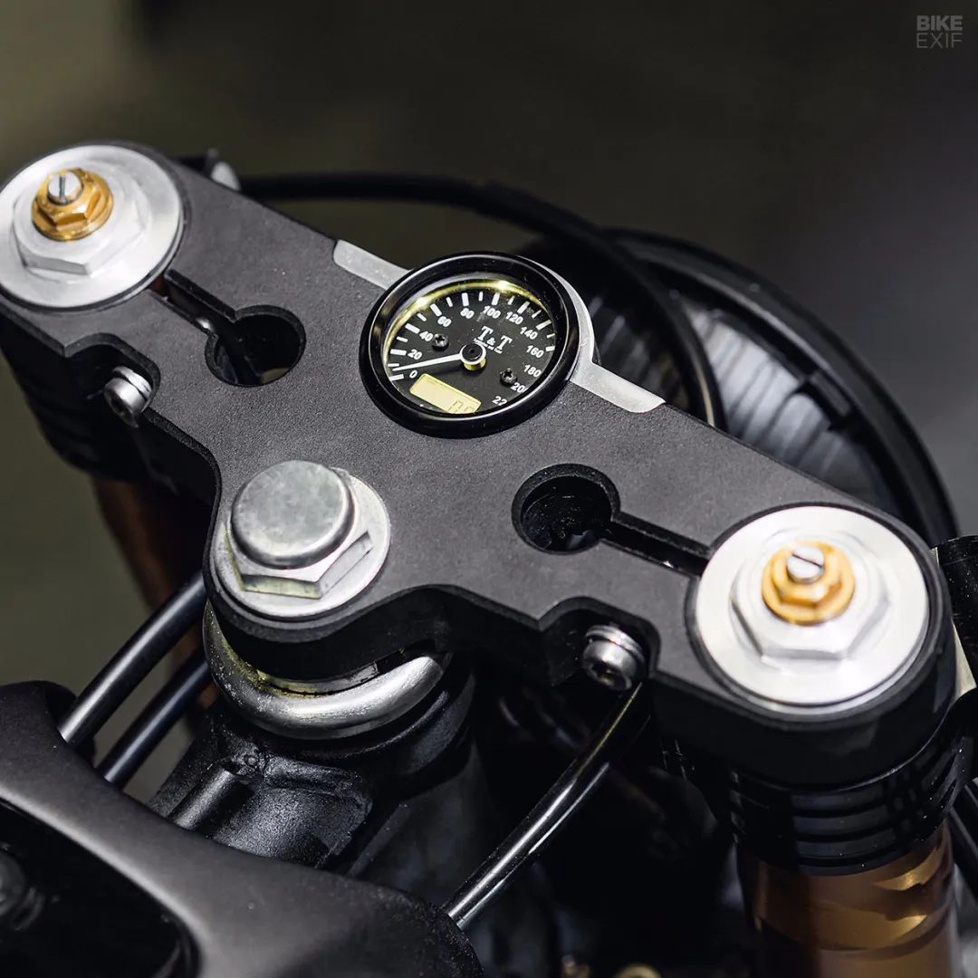 車頭部分的改動(dòng)很大,為了增加更現(xiàn)代元素以及更好的騎行質(zhì)感,倒置前減震來(lái)自鈴木GSX-R,前制動(dòng)卡鉗和碟盤同樣來(lái)自GSX-R。設(shè)計(jì)師為了保留這款車的原汁原味,將原車輪轂進(jìn)行了改裝,使其能夠安裝上這些現(xiàn)代零部件。上聯(lián)板的中間處巧妙的鑲?cè)肓说聡?guó) MMB-Messtechnik的儀表,看起來(lái)十分協(xié)調(diào)。車把上的按鍵以及反光鏡也做了相應(yīng)調(diào)整,改裝過(guò)的原車輪轂配備了Metzeler Tourance輪胎。