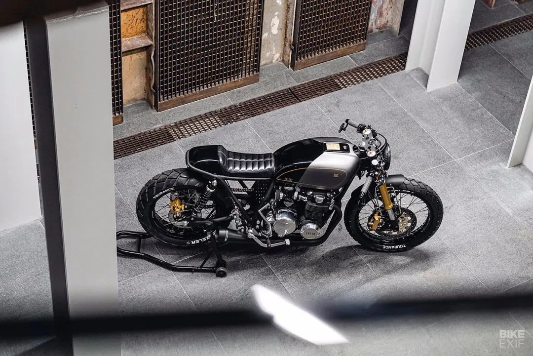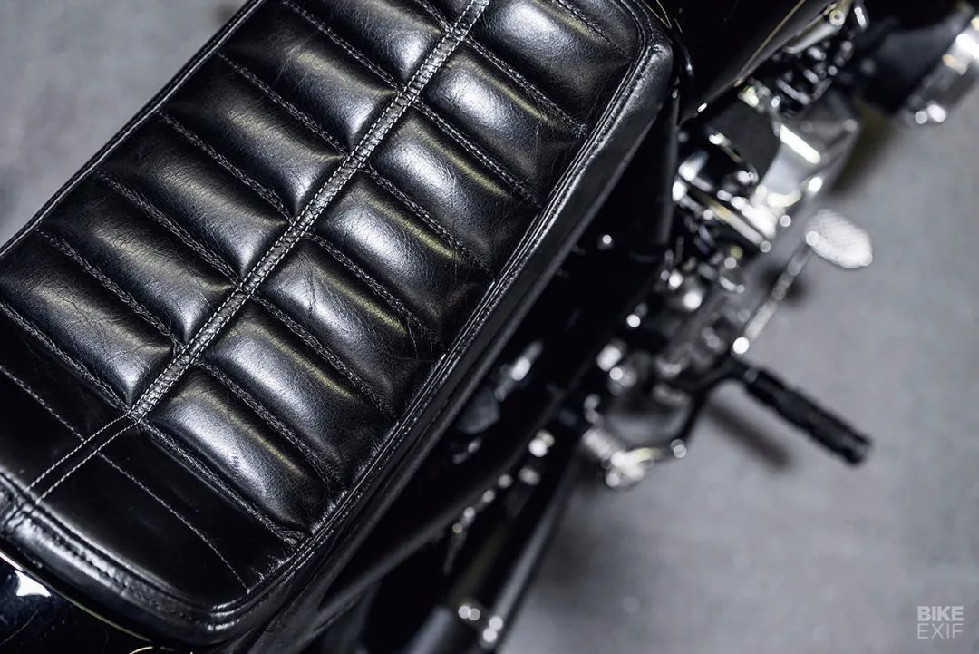 為了符合Cafe風(fēng)格,副車架進(jìn)行了重新設(shè)計(jì),手工皮革座椅讓整車的復(fù)古氣息更加濃厚,坐墊下巧妙地隱藏了電池以及一些電子設(shè)備。副車架加上全新的坐墊和整車比例十分協(xié)調(diào)。排氣采用了四合一設(shè)計(jì),后期CB550F正是采用四合一排氣設(shè)計(jì),這樣的設(shè)計(jì)也是向經(jīng)典致敬。