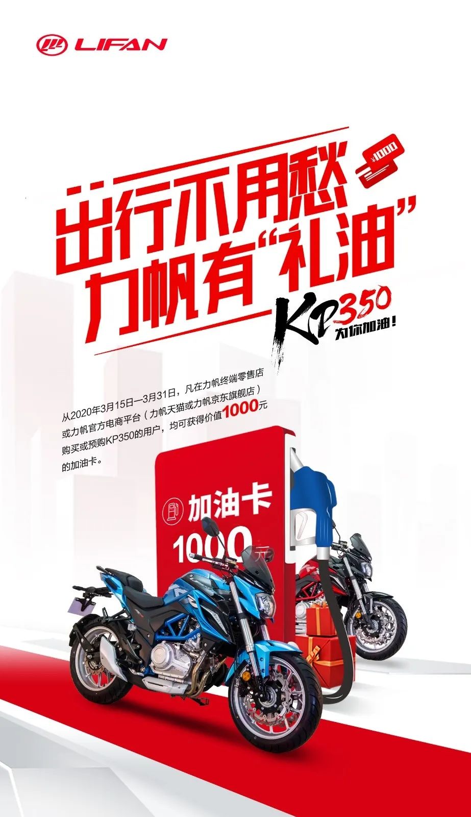 核心提示:出行不用愁,力帆有禮油2020年3月15日-3月31日在力帆終端零售店或力帆官方電商平臺(tái)(天貓/京東力帆摩托旗艦店)購買或預(yù)購KP350