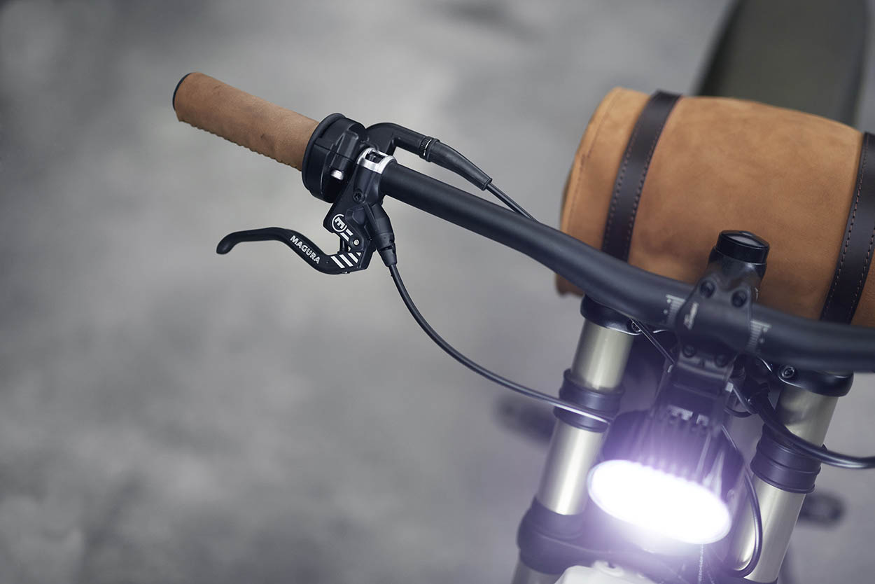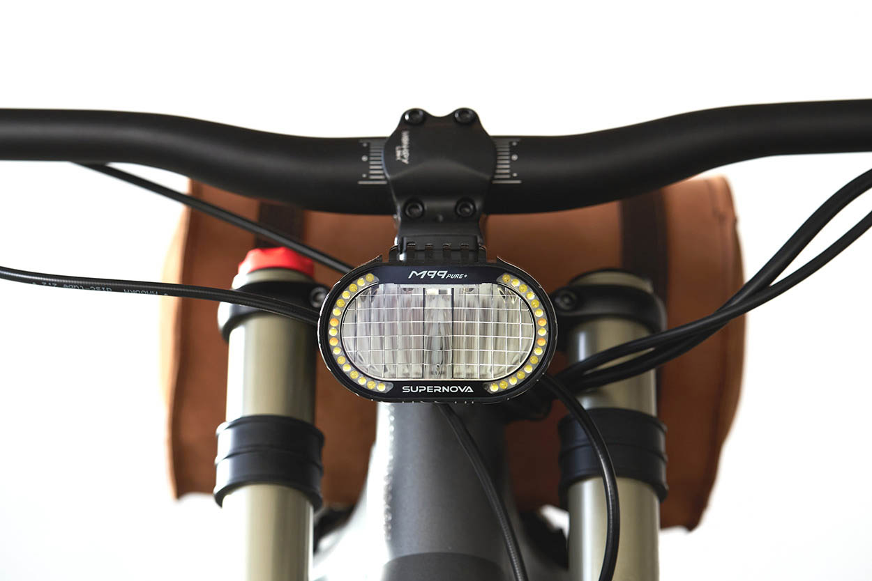 制動器升級為Magura的四活塞MT5 eSTOP單元,以獲得更好的手感。原來的前大燈也必須離開,并已為時尚的Supernova M99 Pure +裝置所取代,它配備了Monkeylink適配器,因此可以很容易地將其取下以用于越野用途。
