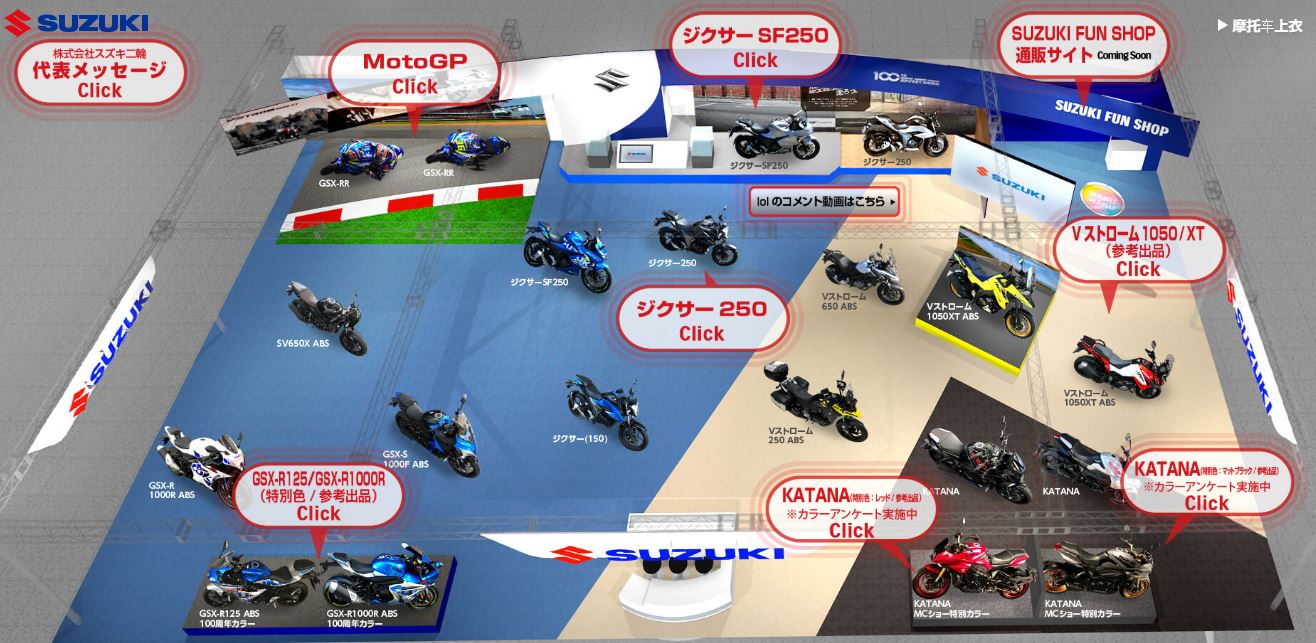 鈴木于2020年3月27日17:00啟動(dòng)WEB摩托車(chē)展,以在網(wǎng)上發(fā)布原本打算在大阪/東京摩托車(chē)展上展出的車(chē)型,由于新冠疫情的影響大阪/東京摩托車(chē)展均被取消。