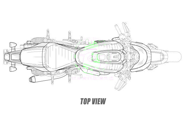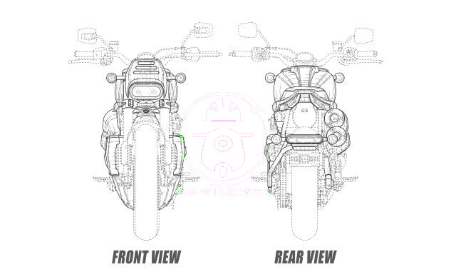 設計圖顯示了雙前盤式制動器,但虛線并不能很好地顯示卡鉗。前懸架似乎是倒叉,根據(jù)測量,前傾角約為23°。盡管可以發(fā)現(xiàn)聯(lián)動裝置,但我們無法很好地看清后部的單震。像FTR一樣,Harley的設計使用了后輪胎支撐牌照板托架,該牌照板托架通過管狀安裝件固定在后搖臂上,盡管管架的角度和直徑看起來不像印第安那樣優(yōu)雅。