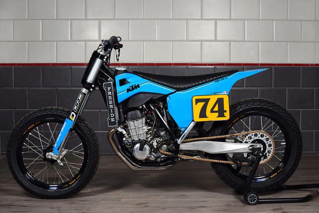 Pierre Dhers使用的是2013年的KTM 450 SX-F作為改裝原型車。美式泥地繞圈賽雖然并不是在鋪裝路面上進行,但也不像越野賽或拉力賽那樣路況復(fù)雜崎嶇不平,所以第一步就是降低車身調(diào)整減震,之后是換裝19寸輻條輪轂。由于泥地賽車用不到前剎車,所以這輛車沒有配置前剎車系統(tǒng)。后剎車則是Brembo單活塞卡鉗。