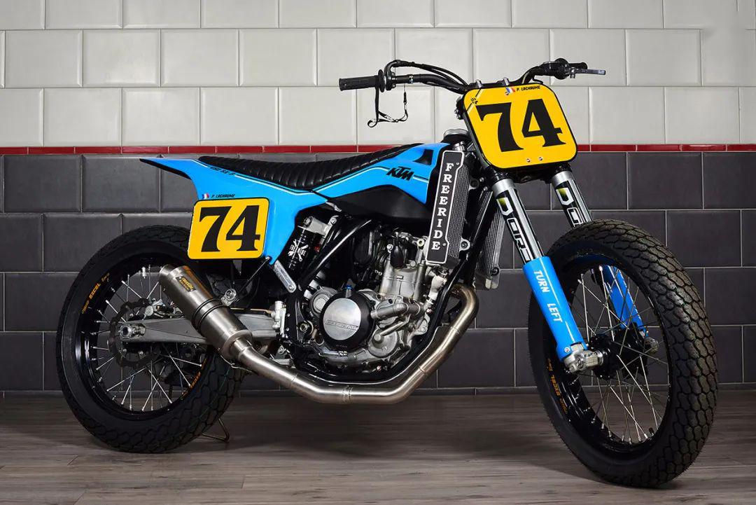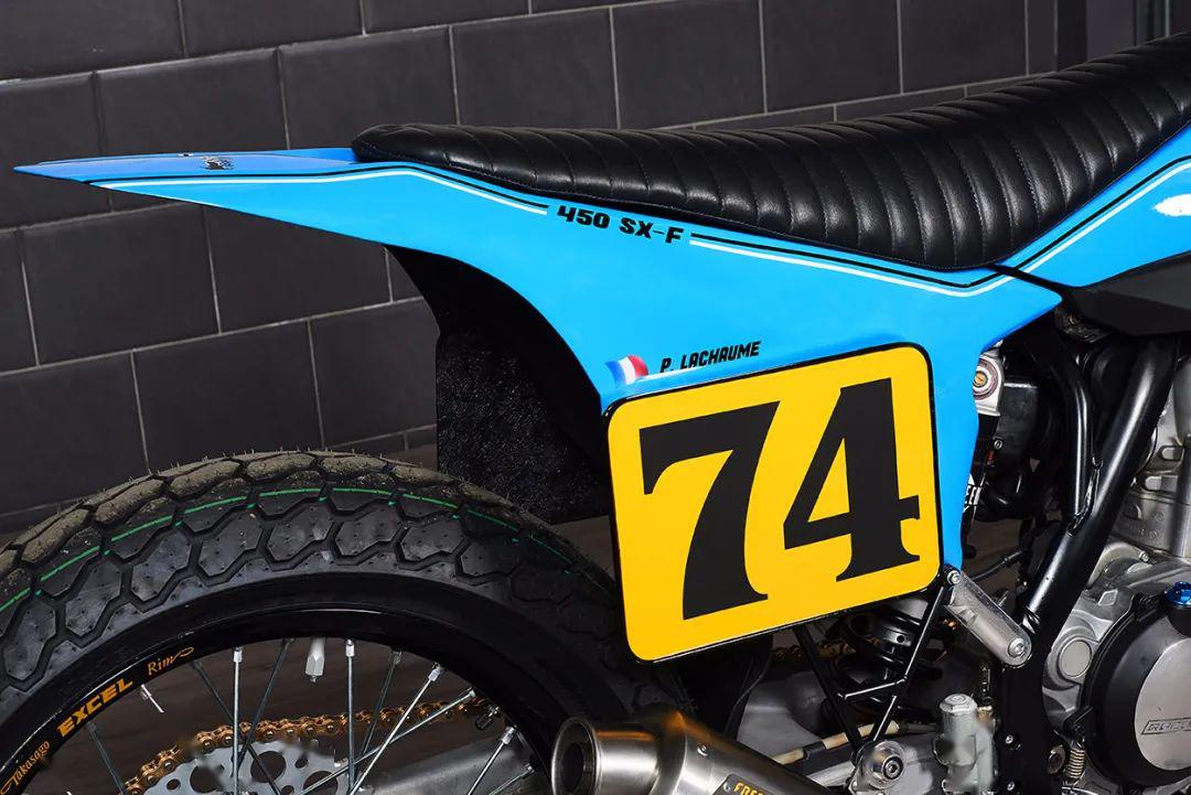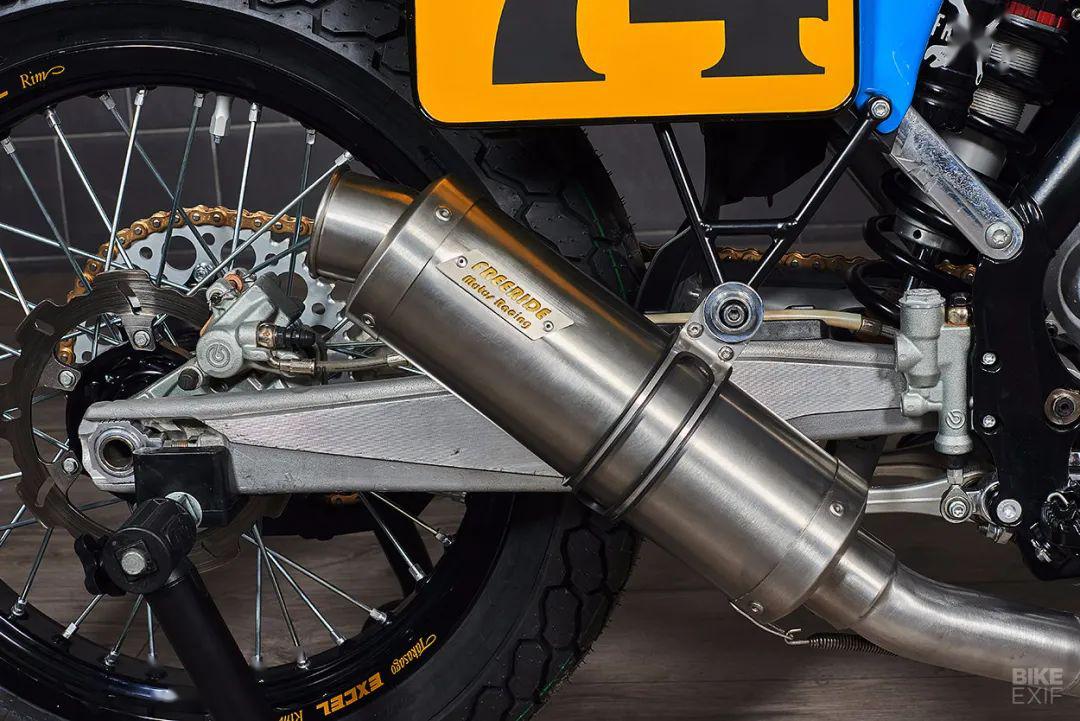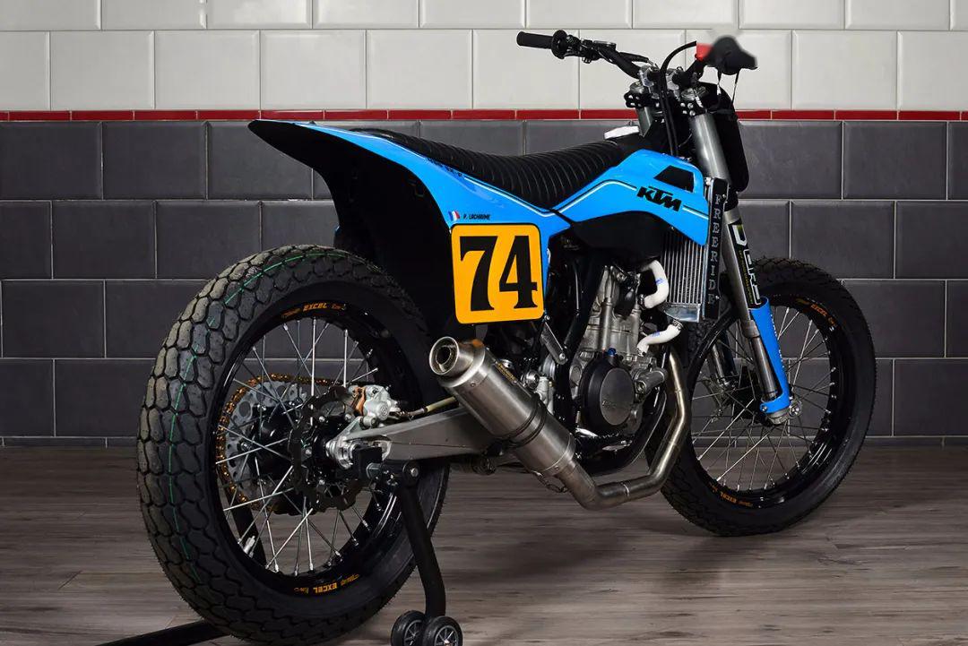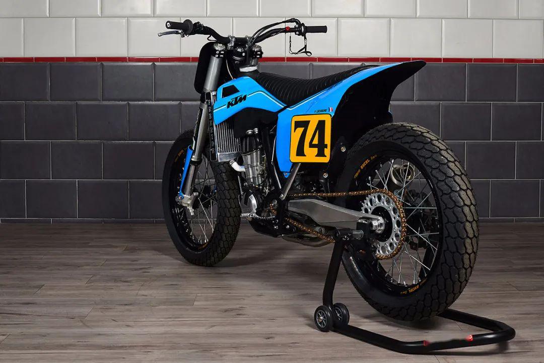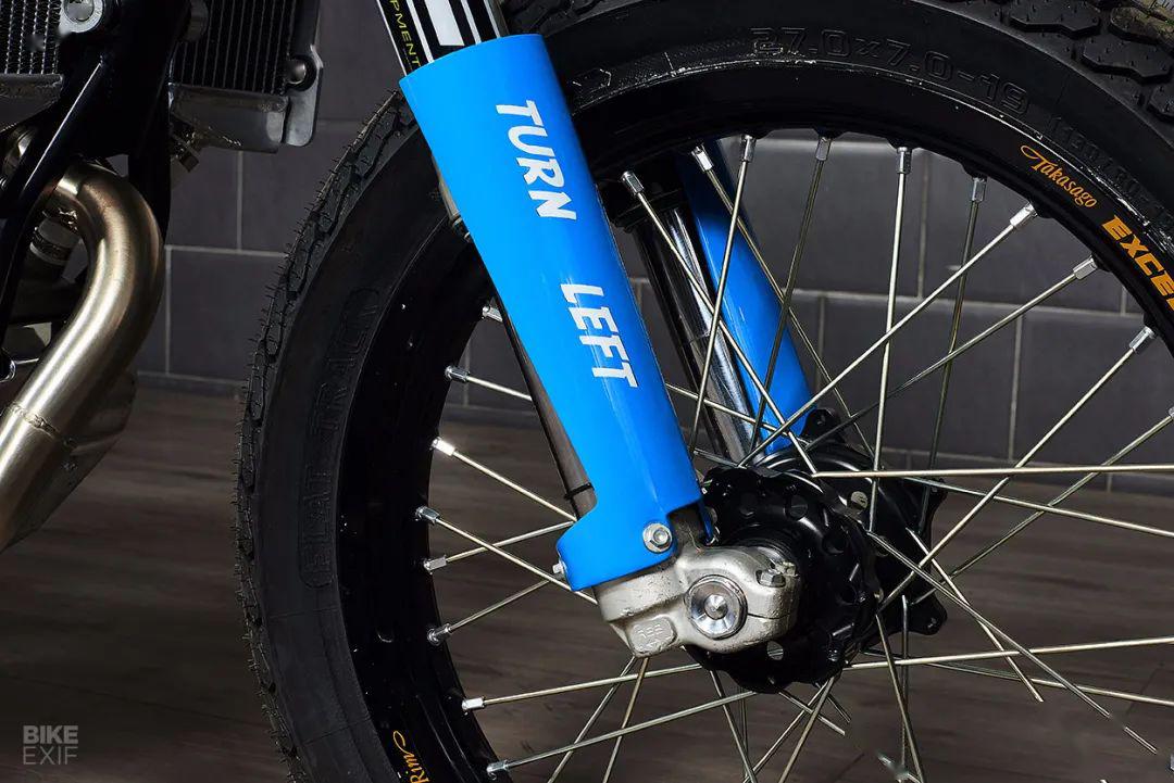 頭段排氣為手工打造,尾段換成了MIVV排氣,并有Freeride Motos Racing的Logo。整車的車殼由玻璃纖維制成,最為出彩的是整車涂裝,藍色主色的靈感來自上世紀(jì)70年代的KTM,那個時候KTM還不是一身橙裝,同時前減震護板上也印著“ NO FRONT BRAKE”(泥地賽車不用前剎)和“ TURN LEFT” (泥地賽都是左彎),非常俏皮。