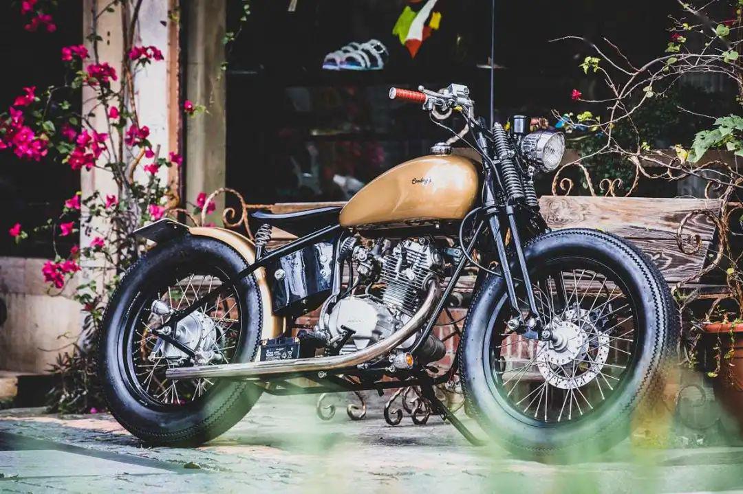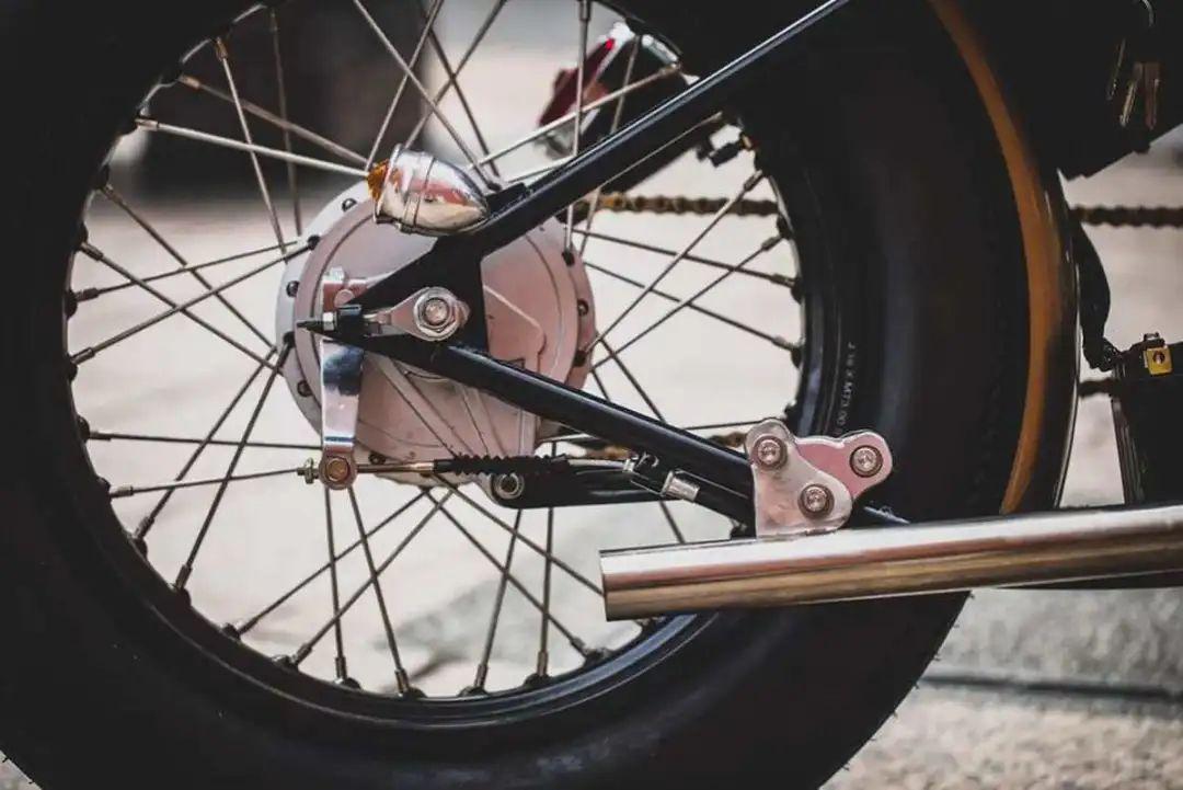 非常具有老味的硬尾車架就是由Cowboy’s Chopper以手工制作,而且由于管徑特別挑選了較細(xì)的7/8寸,因此也進(jìn)一步凸顯出車架后半的迷人線條。前后輪都是使用鋸齒紋路的復(fù)刻胎,并以前4.00-19來(lái)搭配后4.50-18,后土除在硬尾車架的優(yōu)勢(shì)下得以緊貼后輪,座墊則是配上典型的馬鞍座,底下的兩個(gè)彈簧也提供了一定的吸震效果。