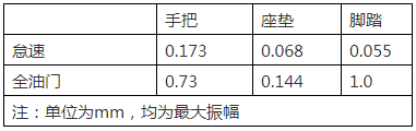 手把位沒(méi)有較為強(qiáng)烈的震感,而轉(zhuǎn)速一路攀升到5500rpm,此時(shí)的震感主要集中在主駕駛員座墊以及腳踏位置,即使865mm座高,厚實(shí)的坐墊,震感依然綿密的傳遞到臀部,但還能接受,主要是腳踏位置,有一些麻感,駕駛感受并不良好。在實(shí)際的振幅儀測(cè)得手把、座墊、腳踏位的振幅分別如下表: