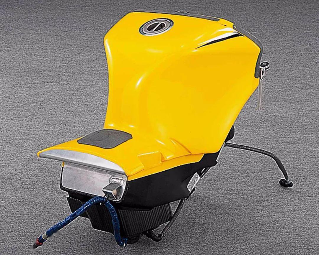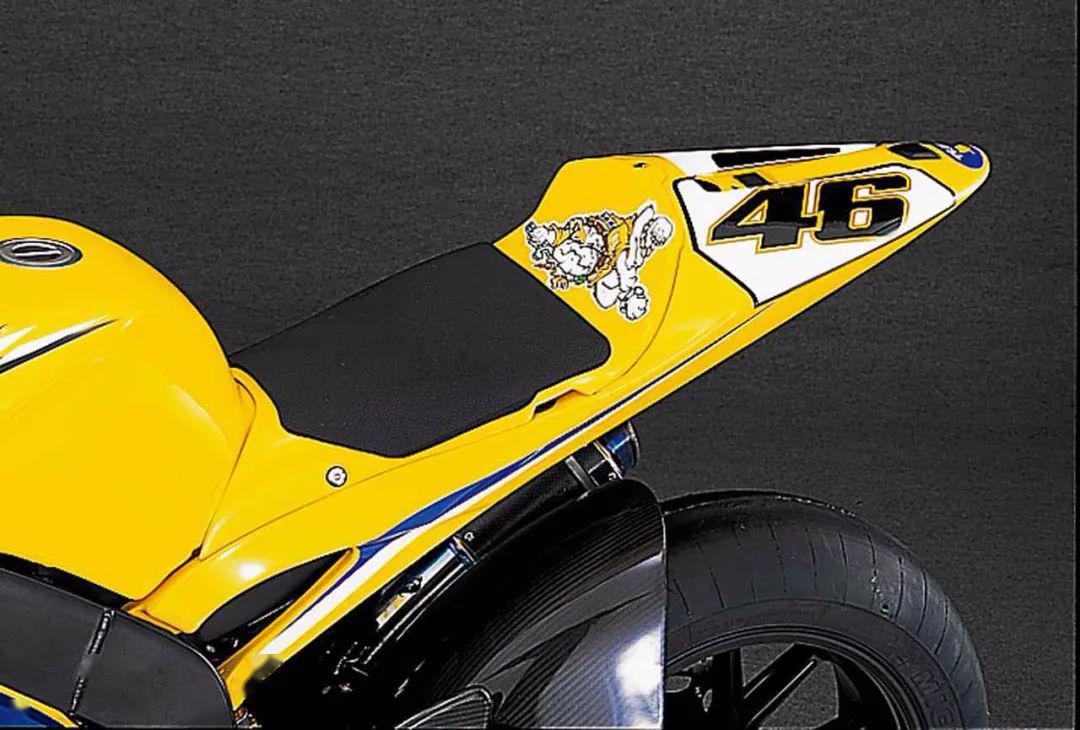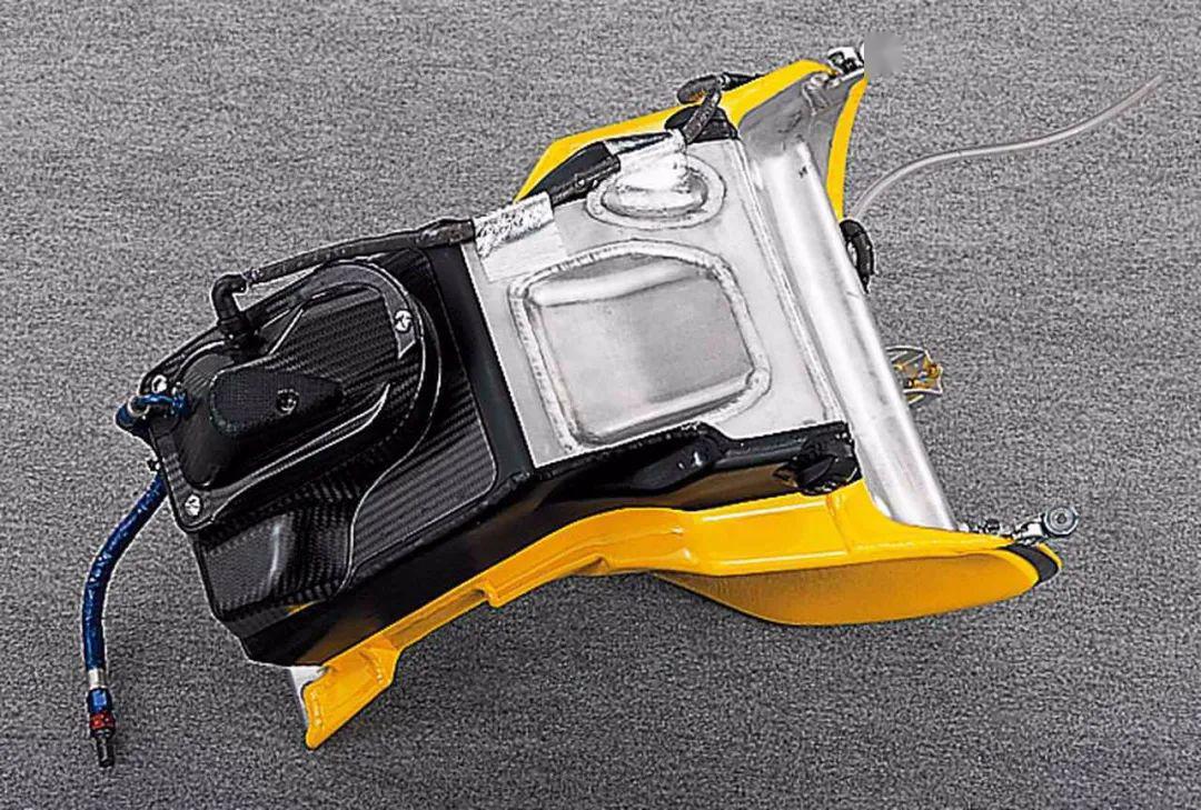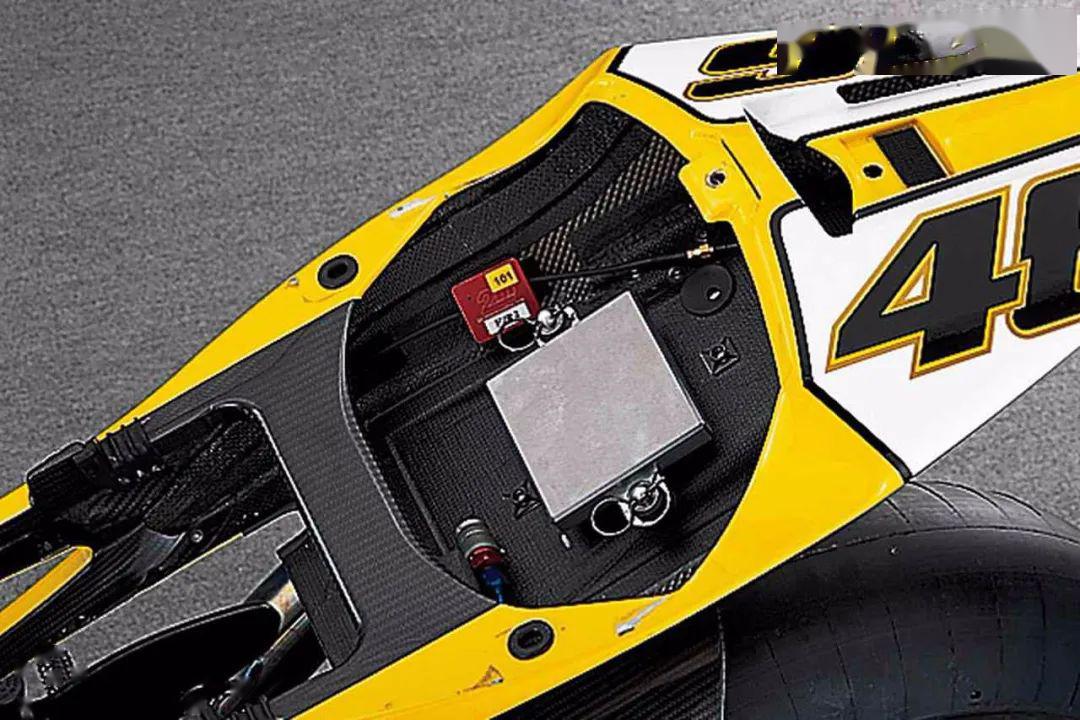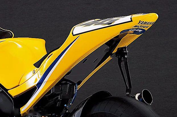 21L的油箱一部分在車座下方,為了更好的平衡整車的重心,現(xiàn)在的YZR-M1也是這樣設(shè)計的。油箱的前部是個蓋子,下面則是進(jìn)氣系統(tǒng)以及各種電子元件。側(cè)面的導(dǎo)流罩設(shè)計了開口為離合器散熱,尾部相比現(xiàn)在的YZR-M1要小得多,預(yù)留了攝像機(jī)安裝孔位,由于規(guī)定的最小車重是算上攝像機(jī)的,所以在不安裝攝像機(jī)時,尾部會安裝鋁制砝碼配重。