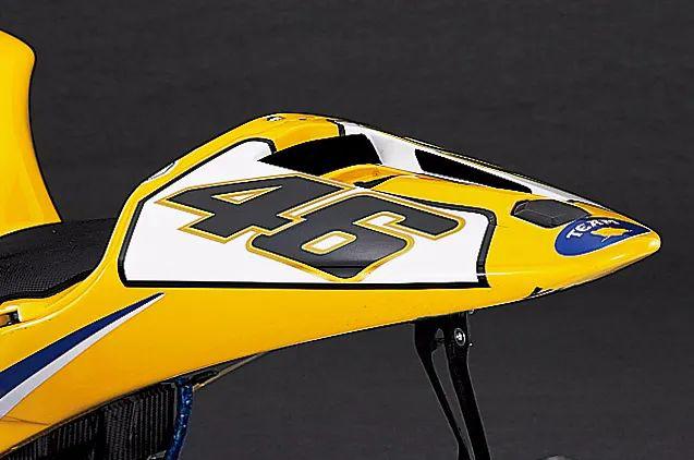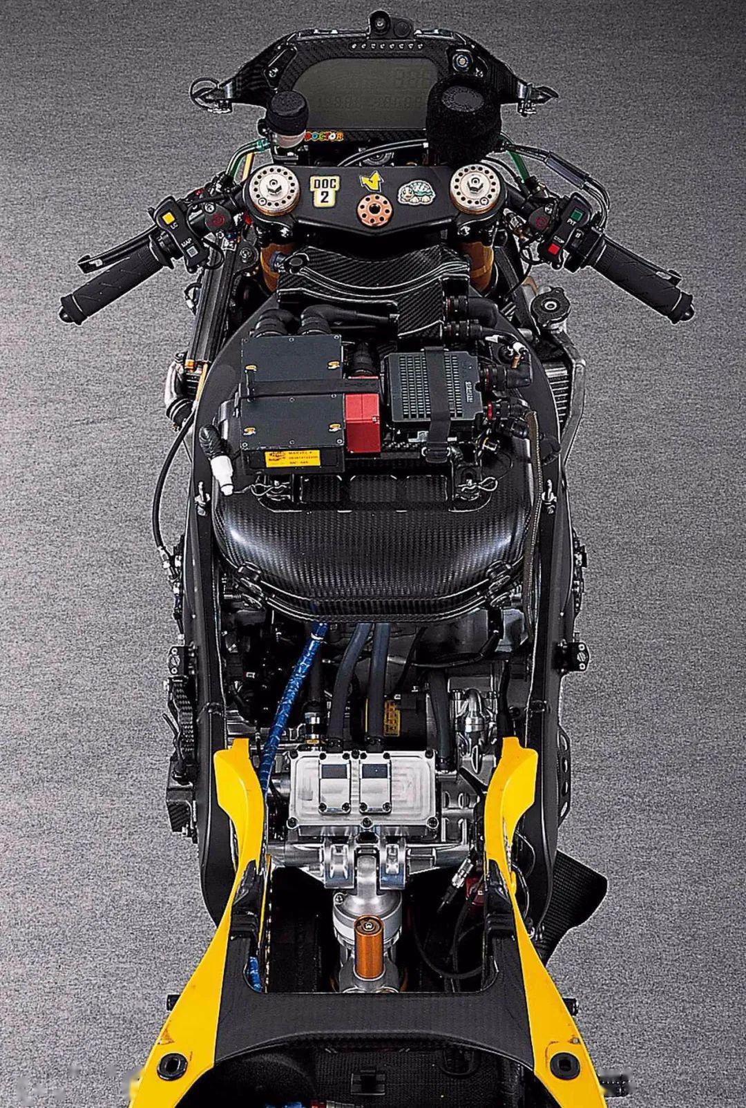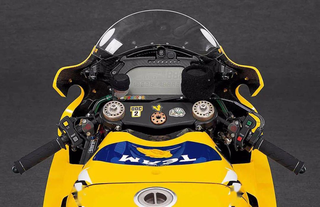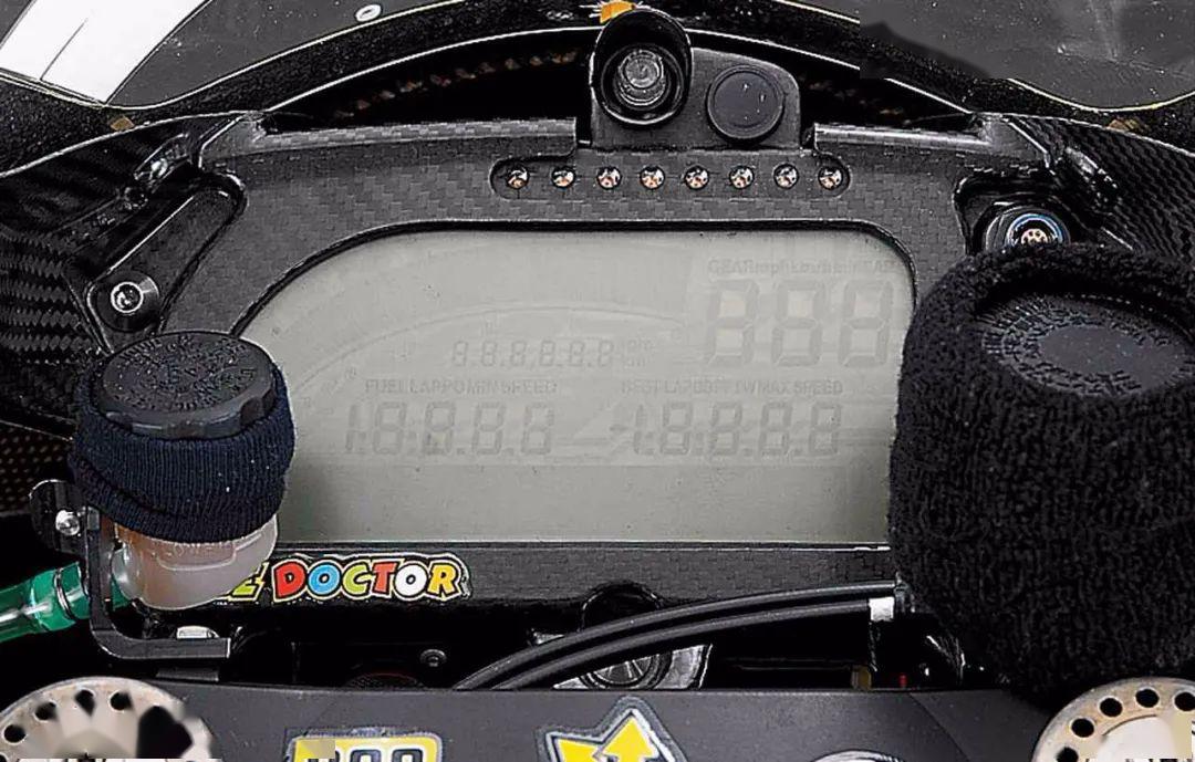 當(dāng)時的空氣動力學(xué)套件并沒有現(xiàn)在這么豐富,所以在這款車上看不到“小翅膀”之類的附加件,車頭和車身都非常干凈,碳纖維加樹脂纖維做成的外殼能夠提供很好的強(qiáng)度。儀表不像現(xiàn)在有這么多功能顯示,最上邊是轉(zhuǎn)速條,下面的六位數(shù)字則是轉(zhuǎn)速,右邊的三位數(shù)字是速度顯示以及擋位顯示,下面兩組數(shù)字負(fù)責(zé)顯示剩余汽油量、剩余圈速、最佳單圈時間、最高速度。如今的MotoGP儀表不僅有各種電控系統(tǒng)顯示,還能收到車隊給車手的信息提示,這在之前可是沒有的。車頭風(fēng)擋上會貼上意大利汽車檢查標(biāo)簽,以方便通關(guān)。
