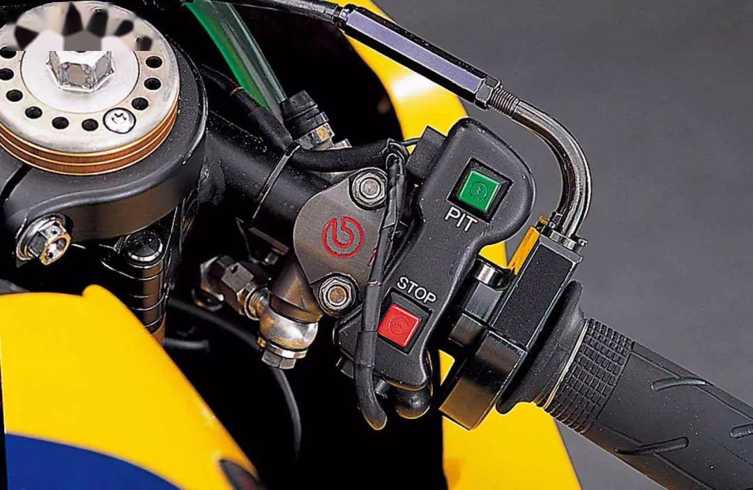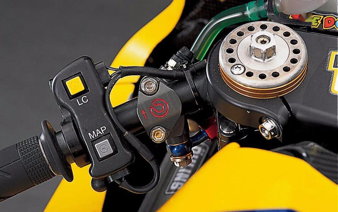 由于缺少電控系統(tǒng),2006款的YZR-M1車把非常簡潔,按鍵很少,左邊車把的“LC”鍵為起步控制按鍵,起步發(fā)車時會用到。下面的“MAP”按鍵是用來調(diào)整發(fā)動機(jī)輸出的,會有幾個預(yù)設(shè)好的輸出模式可以選擇。右車把同樣也只有兩個按鍵,“PIT”按鍵是維修區(qū)限速按鍵,只在維修區(qū)使用,下面紅色的“STOP”按鍵用來關(guān)閉發(fā)動機(jī)。和如今的YZR-M1相比,左右車把按鍵加起來還沒有現(xiàn)在一邊車把按鍵多。值得注意的是,2006款YZR-M1左手沒有拇指剎車按鍵,這也是和目前車款的一大不同,而且2006年還沒有強(qiáng)制安裝剎車護(hù)弓,所以這個零件在當(dāng)時也是看不到的。
