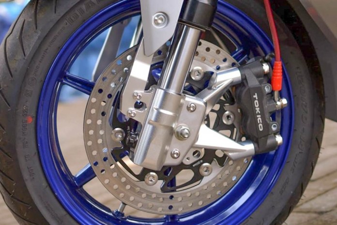 更換完后部懸架之后,緊接著用更大尺寸的輪胎替代原廠胎,倍耐力Diablo Rosso讓它變得格外運(yùn)動(dòng)。后剎車卡鉗由Brembo提供,前剎車則換成Tokico的卡鉗。另外車把,提升器,排氣裝置和后視鏡以及更具運(yùn)動(dòng)性的剎車盤都經(jīng)過改裝。總的來說,外觀上基本保持ADV-150的原始形式,但是底盤上表現(xiàn)的更像X-Adv750。