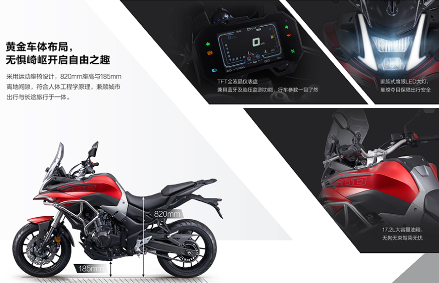 雖然這次發(fā)布的版本并非擅長越野的探索版,但是185mm的最低離地間隙,820mm的座位高度,17.2L的超大油箱,都是典型的拉力車型設(shè)定,良好的通過性和騎乘舒適度,讓無極500DS很好兼顧了日常通勤代步和長途摩旅的雙重功能。