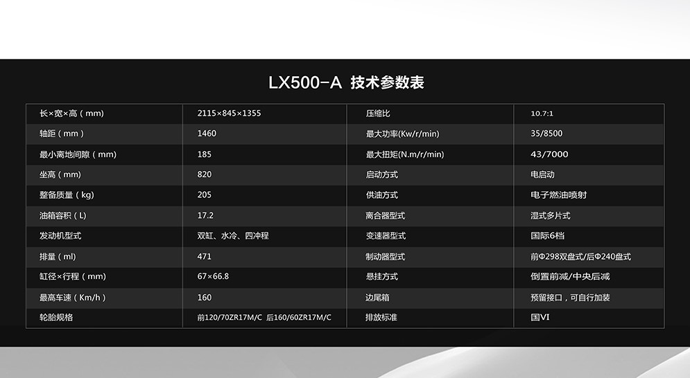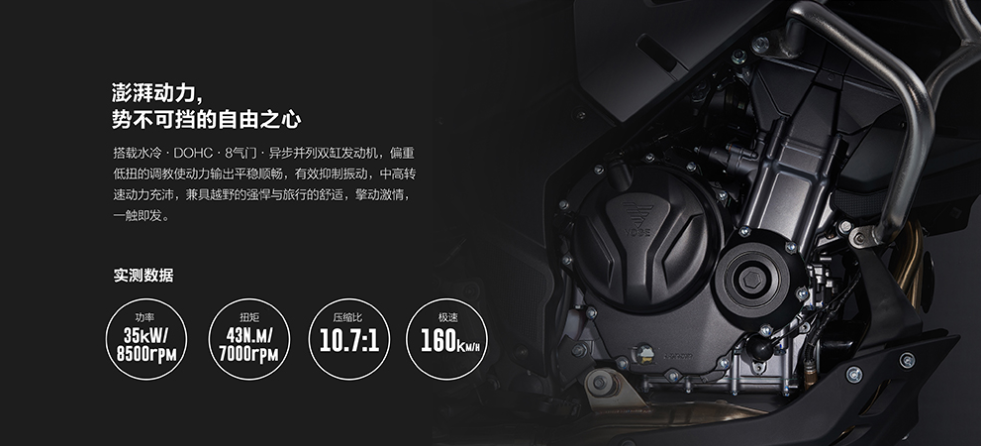 動力方面還是那臺熟悉的KE500雙缸水冷發(fā)動機,最大功率35kw/8500rpm,最大扭矩43Nm/7000rpm,0-100km/h加速5.8秒,極速超過160Km/h。這臺逆向開發(fā)本田發(fā)動機的KE500,排氣聲會有典型的哨聲出現(xiàn),而且在平順性方面表現(xiàn)出色,占據(jù)國產(chǎn)500cc發(fā)動機的半壁江山,很多其他品牌車型都有采用這臺發(fā)動機。