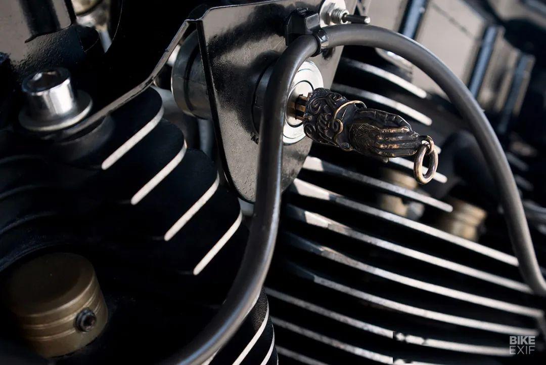 油箱被改得更小了,但足以應付在曼谷使用,車座也改成了單座,車座下的減震彈簧設計別出心裁,腳踏的位置被設計得更高,以此獲得更大傾角。細節(jié)方面這款車也很考究,改用了S&S Super E化油器,空濾罩以及變速箱罩雖然非常簡潔,但和整體風格協(xié)調,對稱的不銹鋼排氣也是手工打造的,包括黃銅油箱蓋以及黃銅車把裝飾,都體現(xiàn)了在細節(jié)上的優(yōu)化。