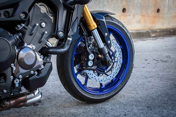 MT-09具有高性能懸架,41毫米的倒立式前叉,擁有137毫米的行程以及可調(diào)節(jié)的預(yù)緊力和回彈力。Advics一體式4活塞前制動(dòng)卡鉗,298毫米前雙盤式制動(dòng)。可以調(diào)節(jié)的后減震器MonoShock。前輪胎為120 / 70ZR17 M / C(58W),后輪胎為180 / 55ZR17 M / C(73W)。