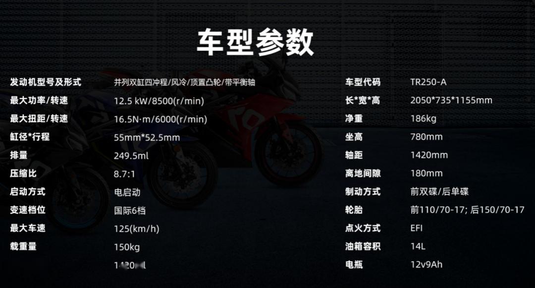 動(dòng)力系統(tǒng)采用的是宗申動(dòng)力提供的250mL的同步雙缸發(fā)動(dòng)機(jī),最大功率12.5kW(8500r/min),最大扭矩16.5N·m(6000r/min),光從賬面數(shù)據(jù)上就能看出這是一款溫順的“仿賽”車型,動(dòng)力性能上對(duì)新手騎士會(huì)相當(dāng)友好。據(jù)相關(guān)負(fù)責(zé)人介紹,之所以選擇這款發(fā)動(dòng)機(jī),除了其溫順的屬性外,同步雙缸迸發(fā)出的聲浪也很重要。