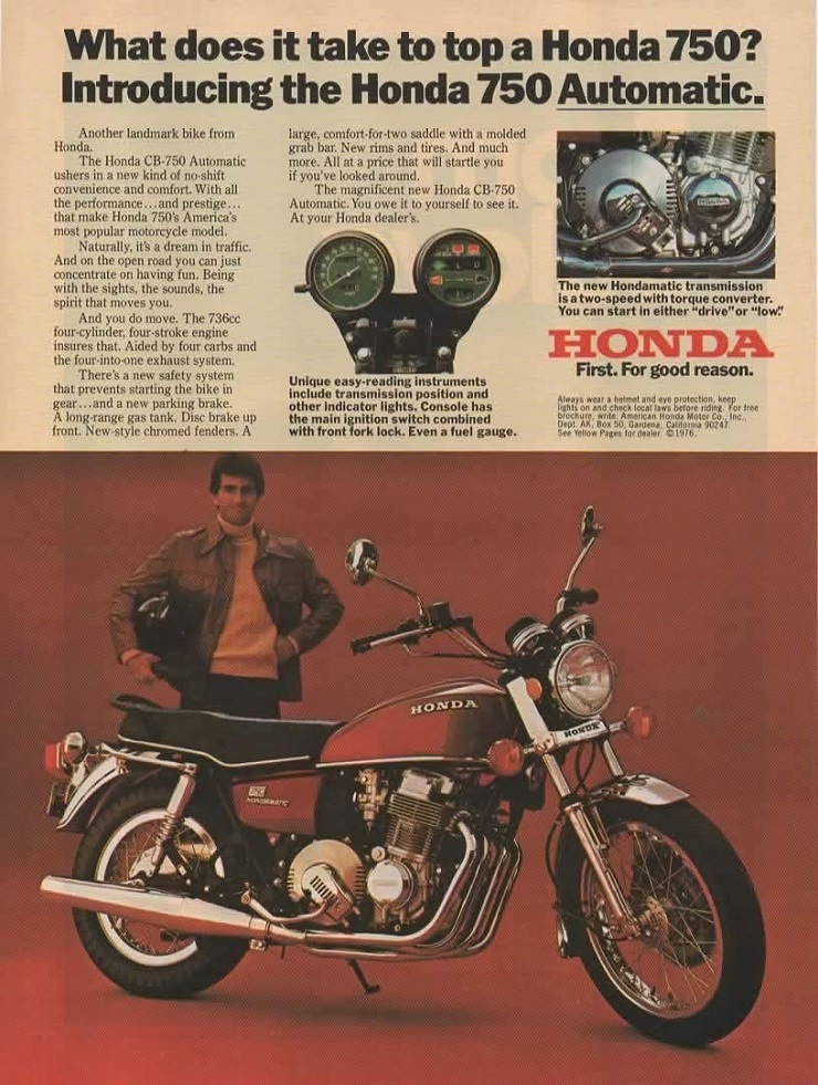 最初的1970年代本田(Hondamatic)旨在使騎行更輕松,更具吸引力(上圖)。