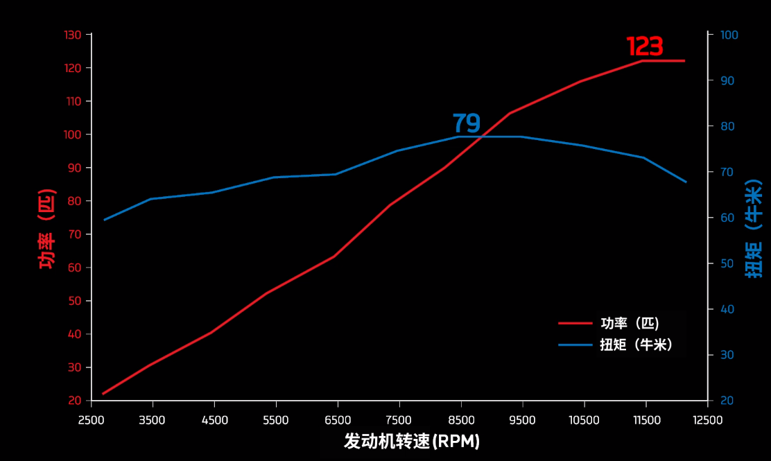 凱旋Triple RS 765搭載一臺,765cc三缸水冷發(fā)動機,最大馬力123ps,最大扭矩79Nm。從凱旋給出的動力輸出曲線圖可以看到,扭矩的發(fā)力轉速區(qū)間十分寬廣,從2500轉-12500轉扭矩基本保持在60Nm以上。配合166kg的車身重量,可想而知Triple RS 765會帶來怎樣的動力體驗。
