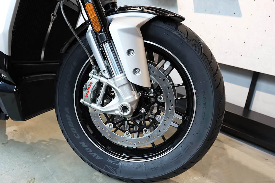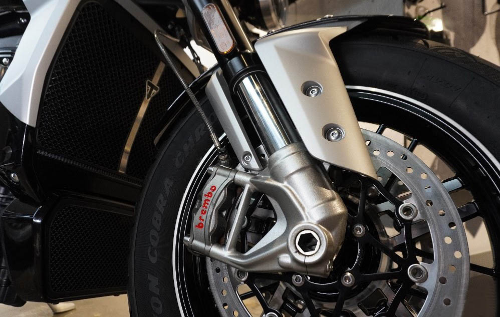 雙320mm前制動盤Brembo M4.30 Stylema一體成型式四活塞輻射式制動鉗,單300mm后制動盤,Brembo M4.32一體成型式四活塞制動鉗,前后都是四活塞卡鉗,另有雙通道的彎道ABS。