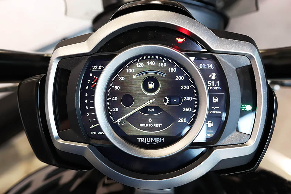 Rocket 3搭載凱旋第二代TFT-LCD儀表板,提供四種行駛模式和全方位LED照明;以及坡道保持控制,牽引力控制、換檔輔助、巡航控制、胎氣監(jiān)測和無鑰匙啟動、加熱手把、集成GOPRO控制的藍牙系統(tǒng)等等。