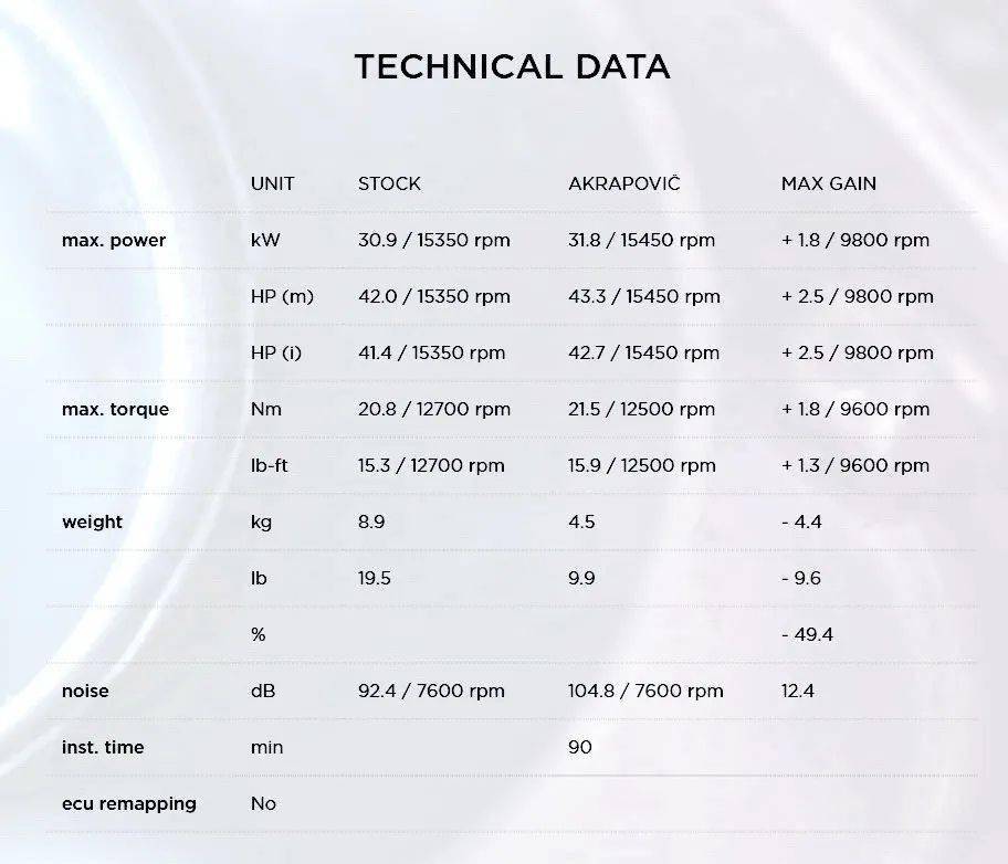 參考 “ 蝎子 ” 所做的測(cè)試,與原廠排汽系統(tǒng)相比,改裝的排汽系統(tǒng)、峰值動(dòng)力輸出增加了 0.9 kw(標(biāo)準(zhǔn)狀態(tài) 30.9 kw/約 42 匹、改裝狀態(tài) 31.8 kw/ 約 43.3 匹),最大差異值在 9,800 rpm 的時(shí)候、 “ 蝎子 ” 改裝排汽系統(tǒng)獲得了比標(biāo)準(zhǔn)排汽管狀態(tài)多 1.8 kw 的輸出。此外,重量也大幅降低了 4.4 公斤。