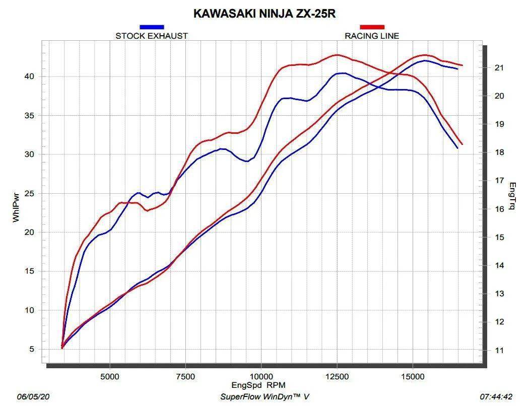 改裝品牌一般都是采用后輪輸出的測(cè)試模式,此測(cè)試模式之下、Kawasaki Ninja ZX-25R 的峰值動(dòng)力輸出為 42 匹,那么以曲軸輸出的測(cè)試模式之下、估計(jì)其峰值動(dòng)力輸出將達(dá)到 45 匹甚至更高。