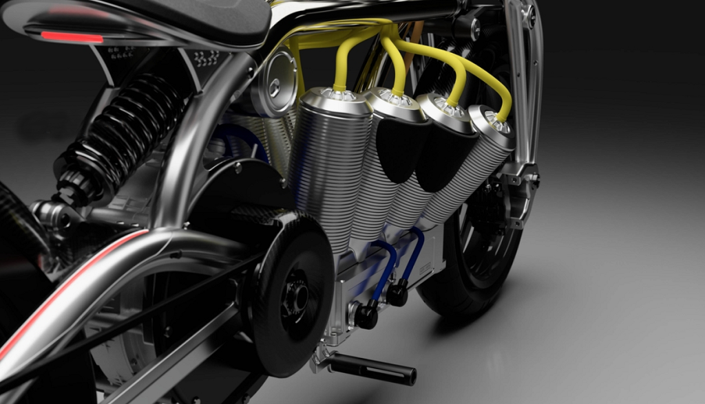 柯蒂斯·宙斯給人留下最深刻印象的一點是,將兩個電動機(jī)直接置于駕駛員位置下方的動力總成,形成了完美的E-Twin發(fā)動機(jī)形式。E-Twin發(fā)動機(jī)缸體幫助Curtiss Zeus達(dá)到170馬力的最大功率和393Nm的最大扭矩,E-Twin發(fā)動機(jī)組的動力是14.4 kWh電池組。