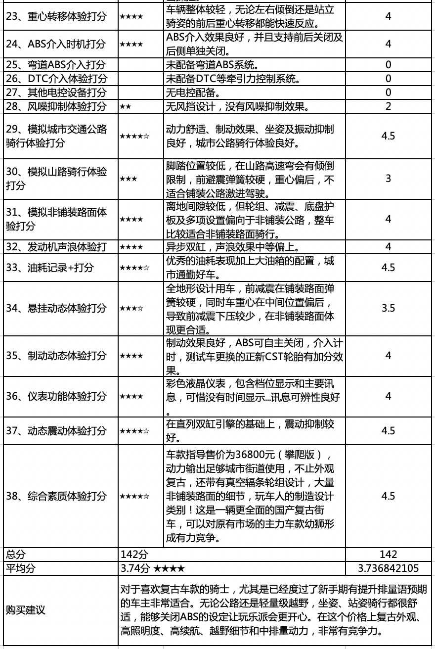 為了保證測(cè)評(píng)過(guò)程更加真實(shí)、客觀的同時(shí),提供更具公信力的測(cè)評(píng)報(bào)告, 中國(guó)摩托車(chē)聯(lián)合測(cè)評(píng)采用了國(guó)際主流摩托車(chē)測(cè)評(píng)標(biāo)準(zhǔn),整個(gè)測(cè)評(píng)項(xiàng)目多達(dá)38項(xiàng)計(jì)分規(guī)則,囊括目前國(guó)內(nèi)摩托車(chē)消費(fèi)者關(guān)心的普遍性問(wèn)題。