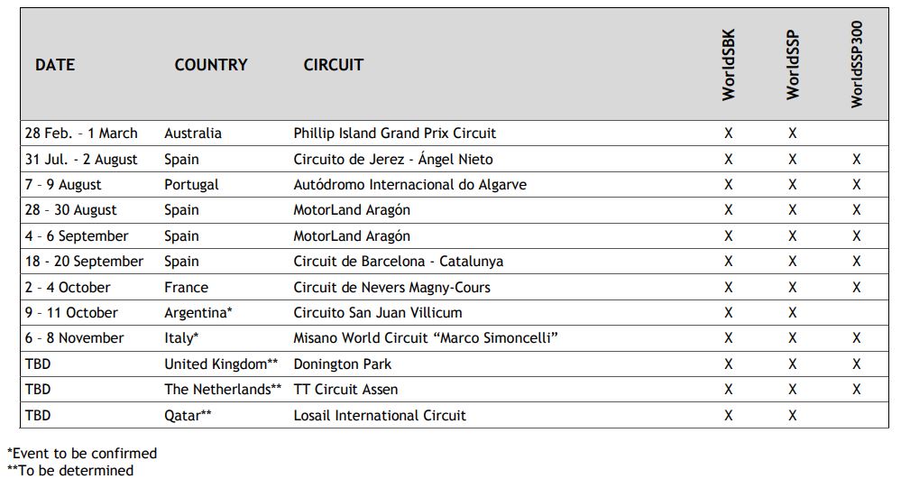 到目前為止,已經(jīng)確認(rèn)了2020年WSBK修正賽季的六輪比賽,有可能確定兩個(gè)比賽周末,還有三個(gè)額外的比賽周末有待確定。